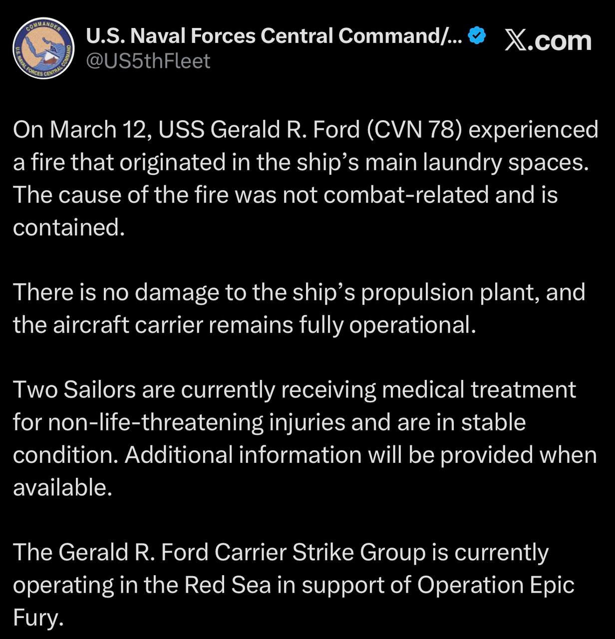 Besides aircraft, America's aircraft carriers are also having problems. The US 5th Fleet, which has no base anymore since Bahrain is burnt toast, reported “a fire that originated in the ship's main laundry spaces. The cause of the fire was not combat-related and is contained.” This was in the USS Gerald Ford.