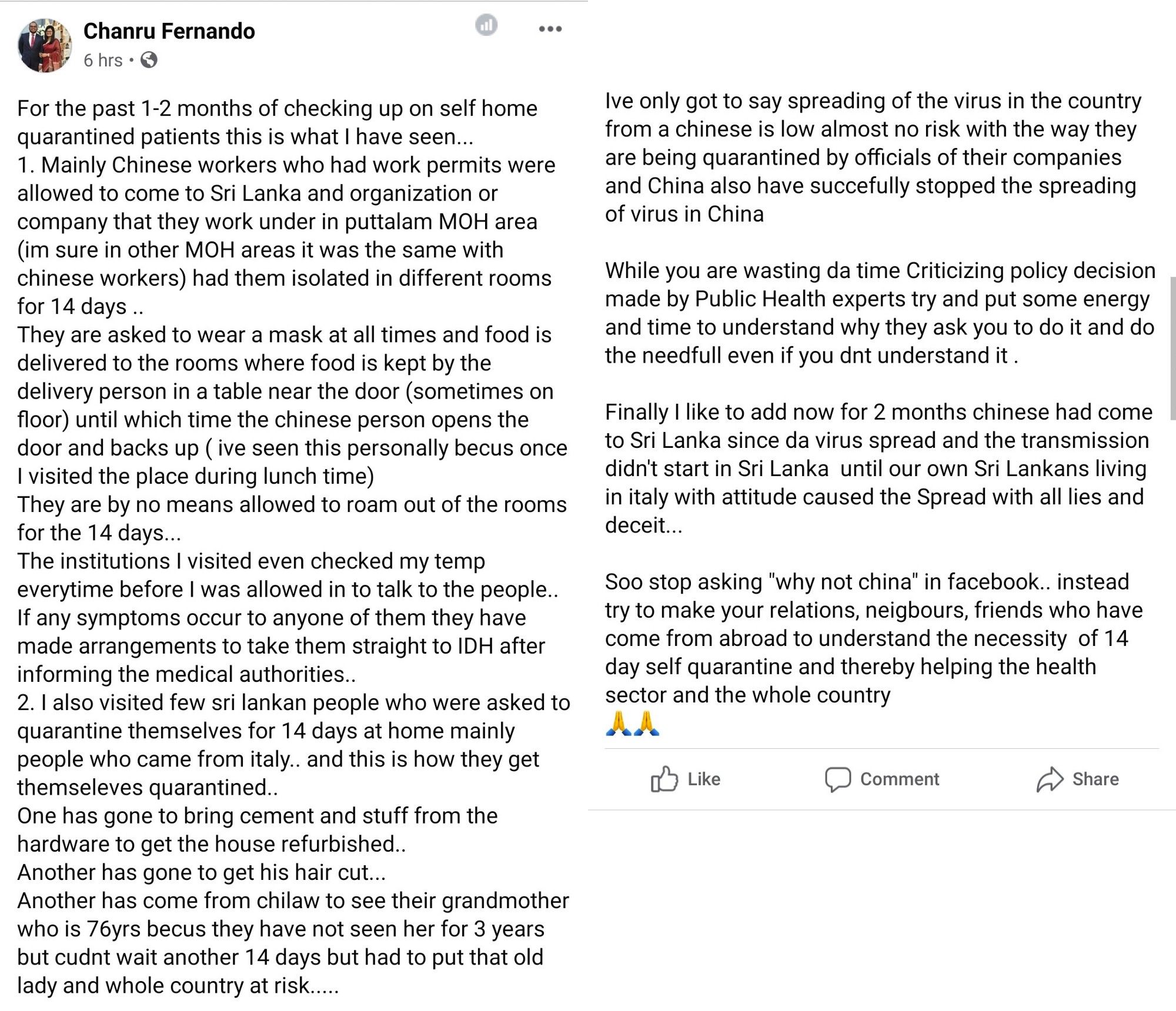 “Finally I like to add now for 2 months chinese had come to Sri Lanka since da virus spread and the transmission didn’t start in Sri Lanka until our own Sri Lankans living in Italy with attitude caused the Spread with all lies and deceit…”