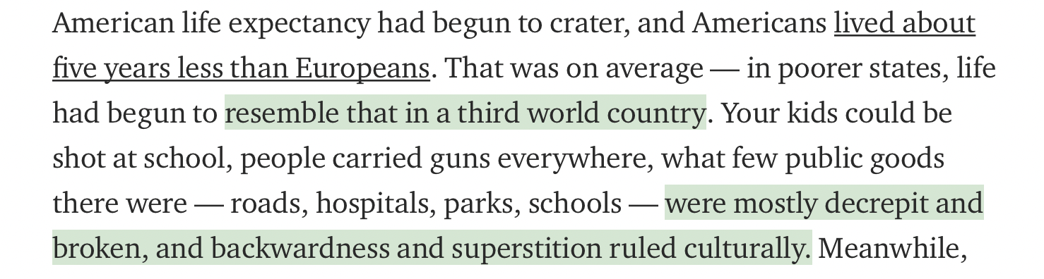 I like umair haque, but it’s just awful when he says “the average American began to live a life more suited to a third world country.” Like we’re uniquely suited to shit. April D. Ryan seems cool but not when she says “what makes us different from a third world country & dictatorships?” Like we’re all despotic hellscapes. These are people I like, and even they insult me. You can imagine how the racists are.