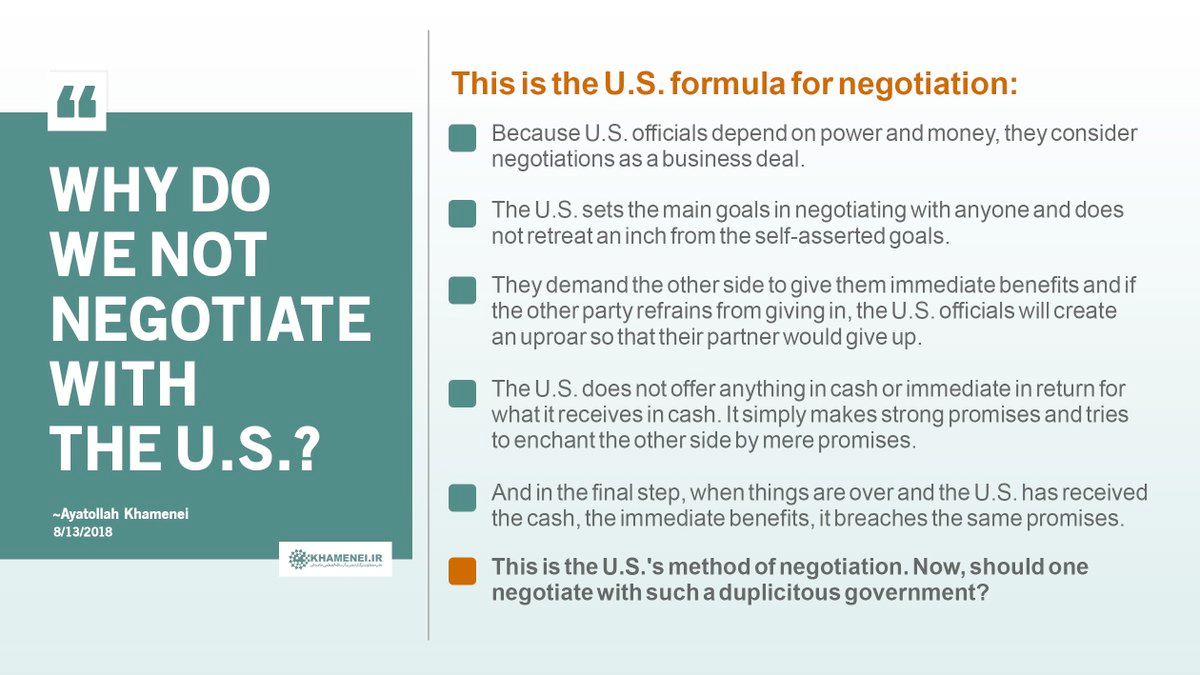 Iran is ready to defend itself, whatever the cost, and simply do not accept Trump as boss of anything except pulling Netanyahu's chair out. Ayatollah Khamenei is an old hand and knows that the Americans are not to be trusted, leaving nothing but broken treaties behind them (just ask the Actual Americans). Khamenei said, “One must not negotiate with a government like the US government,” and though the steadfast President Raisi is gone, the Iranians are still not morons. Who do you think will win a Holy War over their own holy land? Those reduced to bombing refugee camps and hospitals, or those defending them?