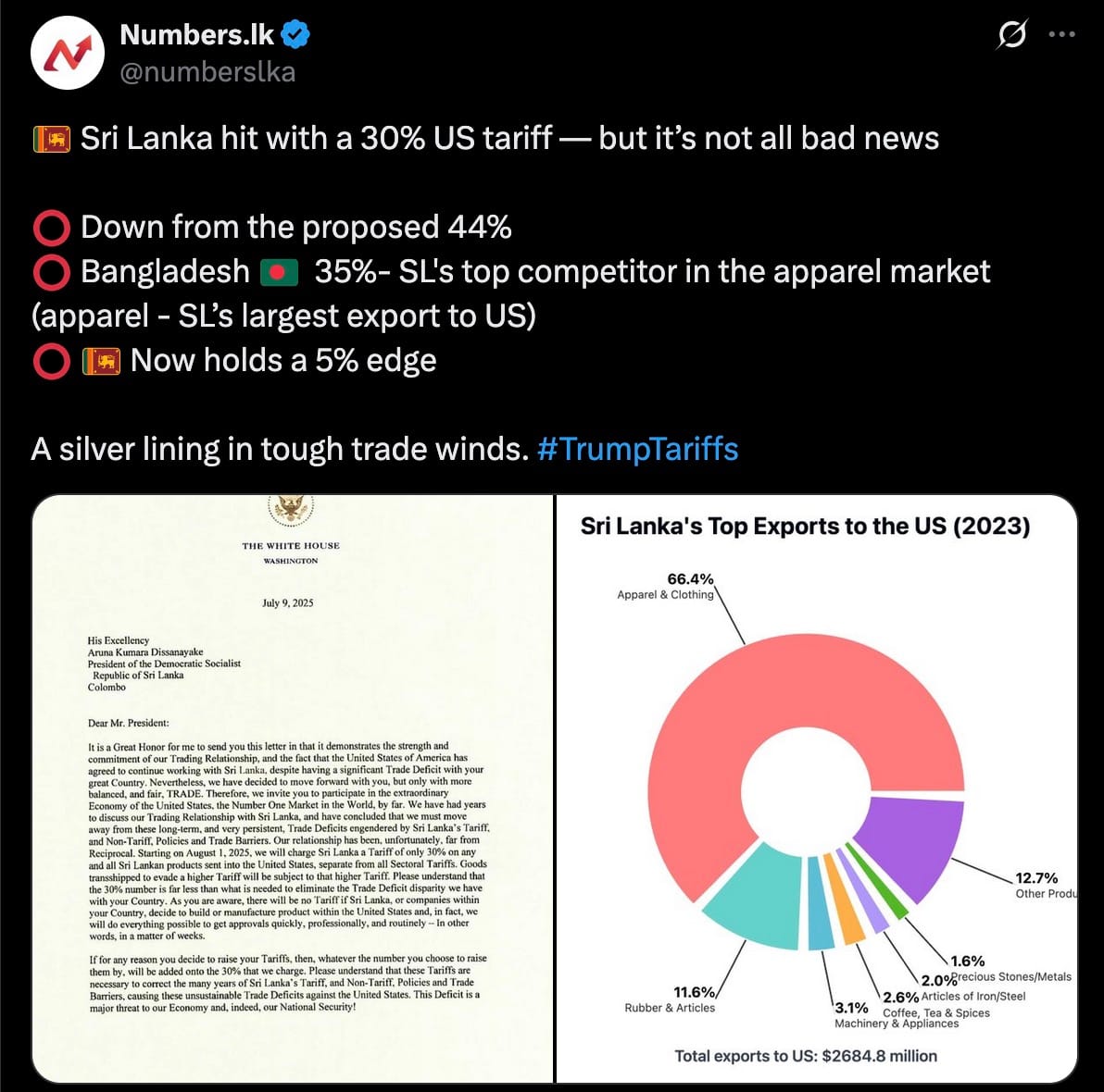 There's been a sea change in local coverage since when tariffs were first announced in April. Tariffs are still bad for us, but they're bad for everyone, and nobody talks in absolutes anymore. It's all relative. Thus the Central Bank Governor now says, “This shift enhances our relative competitiveness,” and the Chamber of Commerce talks about ‘regional competitors’ and ‘regional peers.’ Sri Lanka isn't even talking about America anymore. We're talking about Vietnam and Bangladesh. Trump tried to move the world, but the world has moved on.