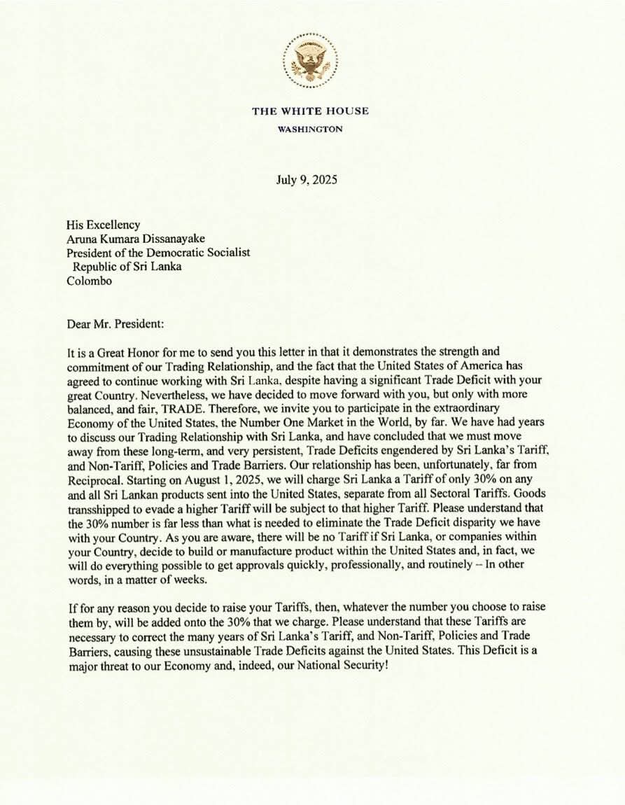 Trump misspelled our president's name in his letter, and the spelling is all over the place. In the copy-pasted letter he said, “There will be no Tariff in Sri Lanka, or companies within your Country, decide to build or manufacture product within the United States.” So there'll be no tariffs on Sri Lanka if we don't make anything in Sri Lanka, great. But does Trump have any idea what Sri Lanka makes? Like the brown guy told Larry King when asked about luxury goods, “Larry, I'm on DuckTales.”