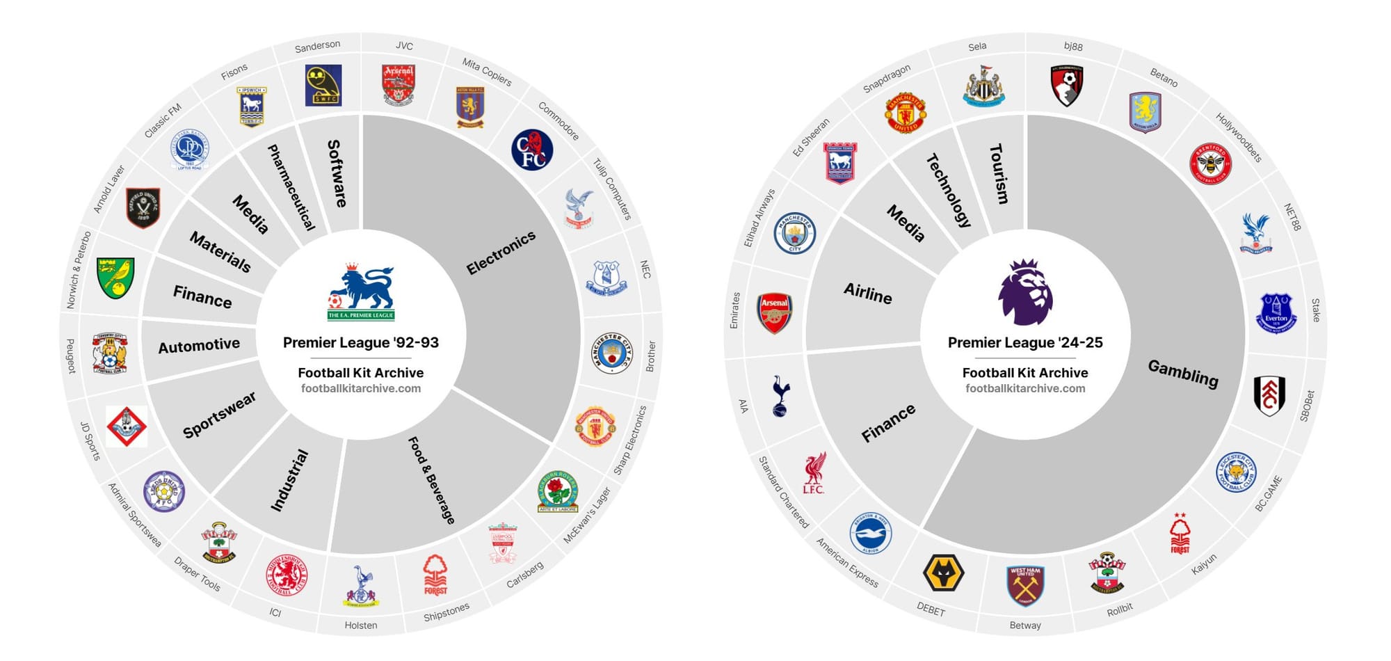 You can see this on charts as much as you want, or you can see it on shirts. Companies that used to hold stock of physical goods are now ephemeral stocks held by other companies. It's easy to scorn sports gambling, but the whole stock market is just genteel gambling, and ultimately a Ponzi. There's little value being created anymore (certainly in England) so it has to be made up. On these football jerseys, you can really see the decline of western capitalism in action. Gambling preys on men, bankers prey on everybody, and fossil fuels consume the planet as we know it. You can see the descent of the western economy into almost pure rent-seeking from those seeking rent on football jerseys.