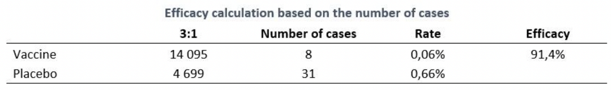 In an unpublished report, they have said that the efficacy of the vaccine is 91.4%. This is based on giving the vaccine to a shitload of people and seeing who gets COVID-19 in the vaccinated vs. the control group, which we can do because we’re in the middle of a pandemic.