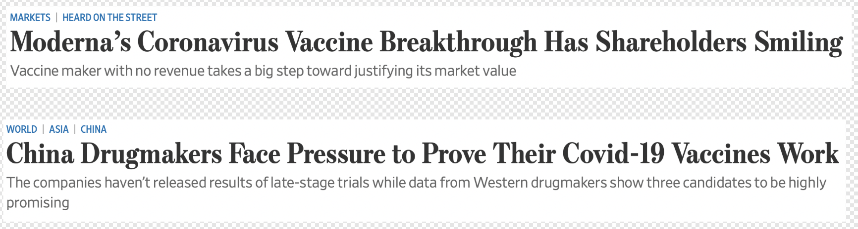 Can you see the problem here? Moderna has never produced a vaccine but they just drop a press release and the WSJ runs it. Meanwhile the well-established Chinese institutions have to show proof. And they do. The WSJ just doesn’t care. It doesn’t fit the narrative.