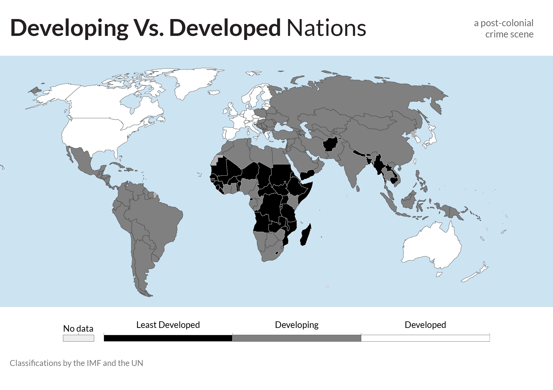 Two maps. First look at a map of developed vs developing nations. I’ve colored developed as white and ‘least developed’ as black because who are we kidding. This isn’t a map. It’s a crime scene.