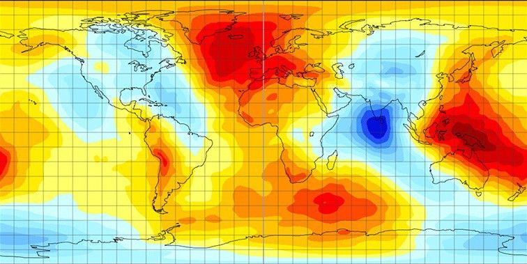 Earth’s gravitational field is much lower than average in some places (dark blue areas) because of water-rich material that lies over the dehydrated remnants of long-subducted tectonic slabs./ Spasojevic et al., *Nature Geoscience, via Wired.