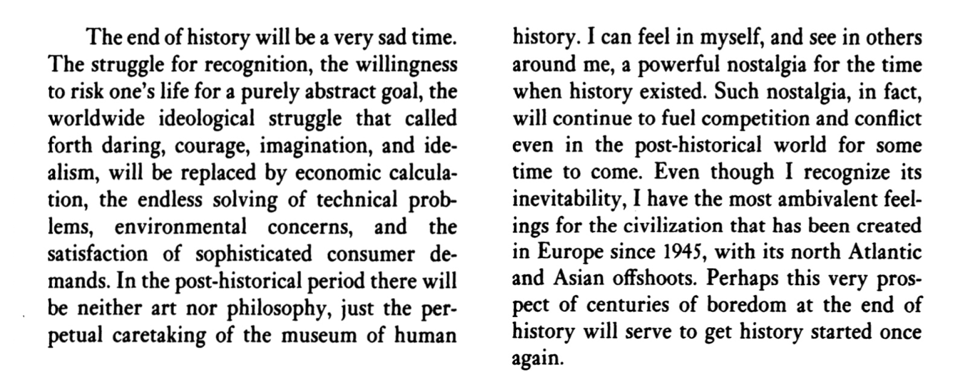 To Fukuyama, the end of history actually dated from 1806, when white people discovered this shit. If they ended up informing everyone through genocide, slavery, and exploitation, well, you're welcome.