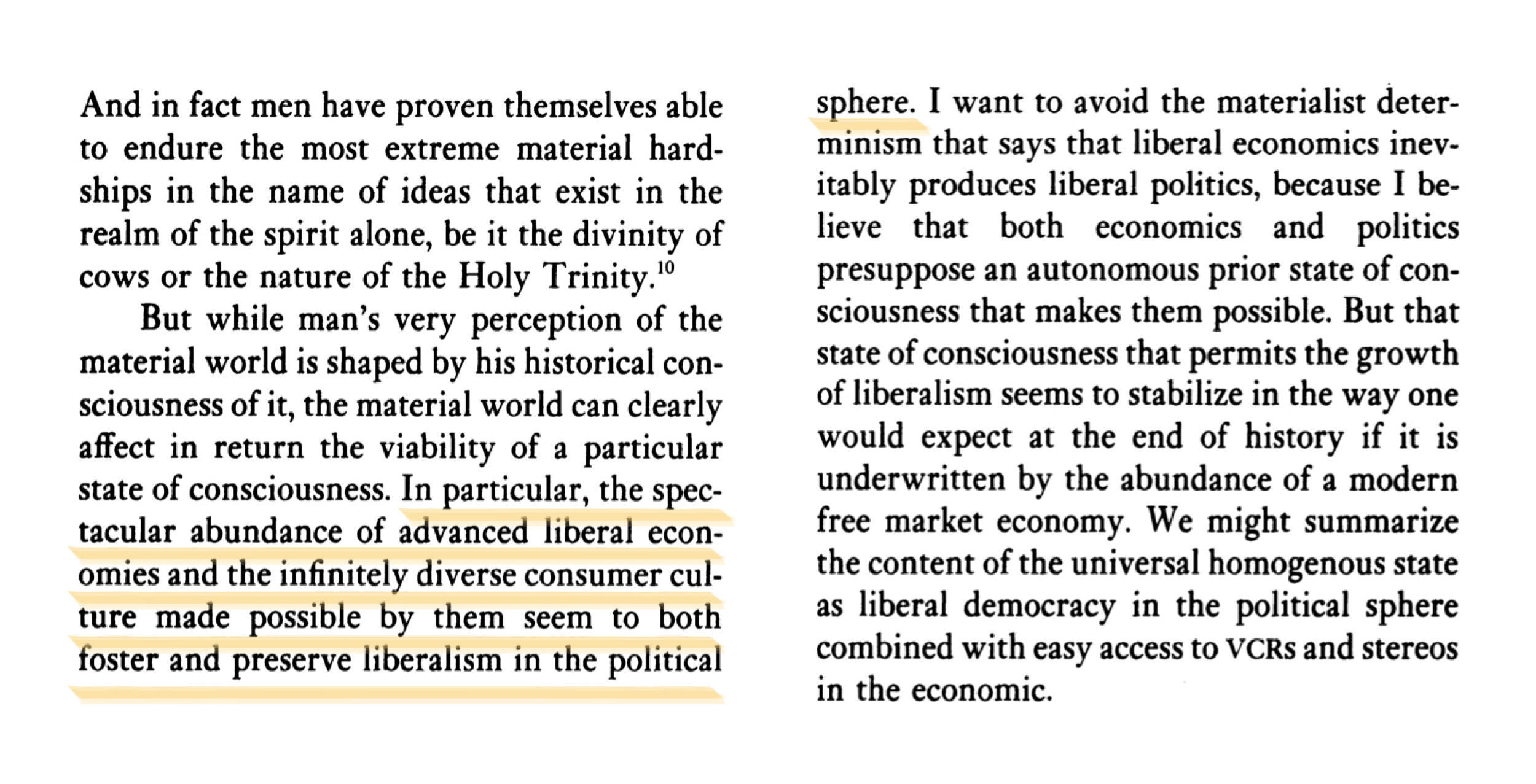 We might summarize the content of the universal homogenous state as liberal democracy in the political sphere combined with easy access to VCRs and stereos in the economic.