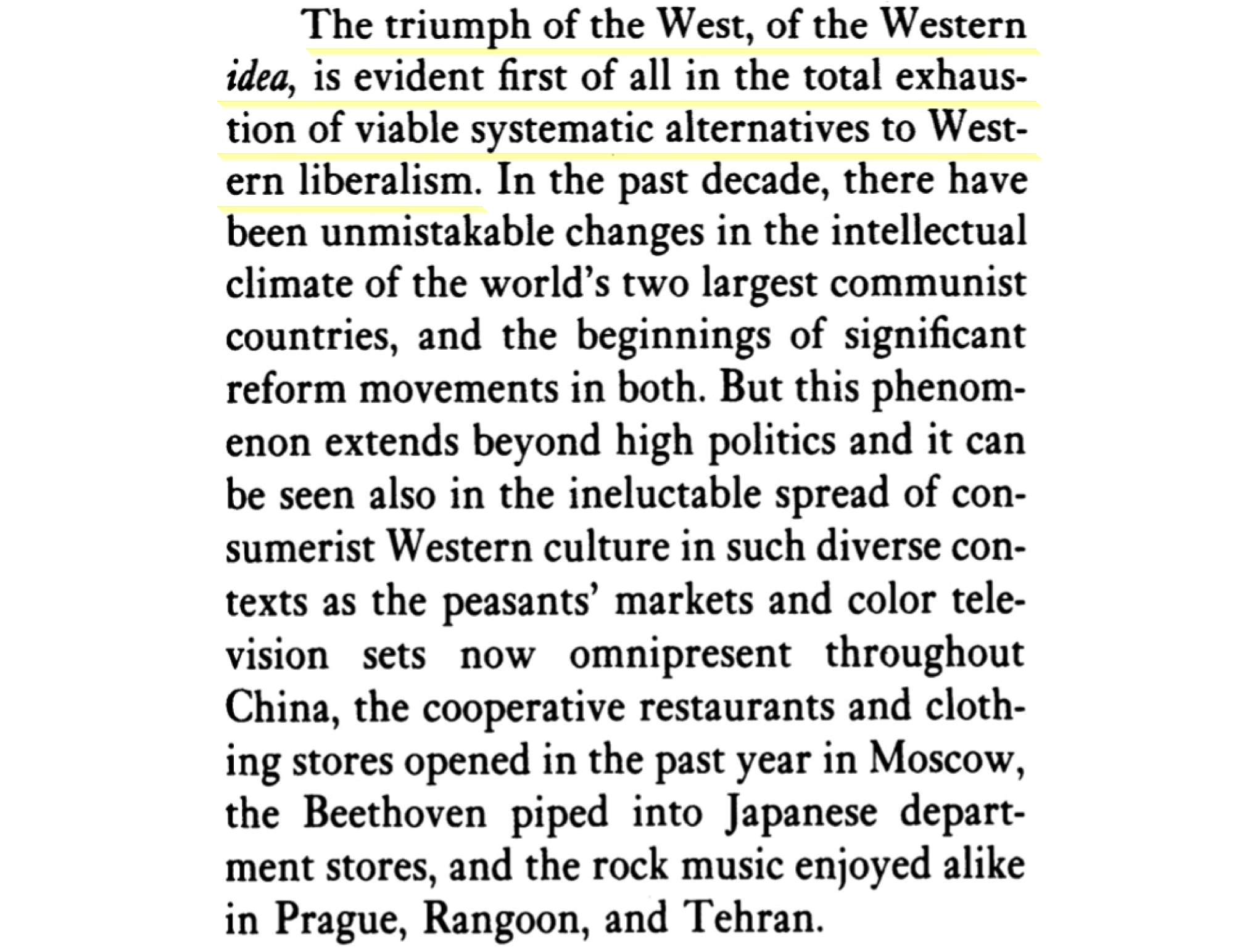 It's tempting to dunk on Fukuyama for hubris, but he's describing actual western thought, not inventing it. When Fukuyama says "that the basic principles of the liberal democratic state could not be improved upon" he's just stating the actual basis of western foreign policy. The West really thinks it's doing people a favor by bombing and besieging them. They're civilizing them. It's not conquest, really, they're just 'extending our principles spatially'.