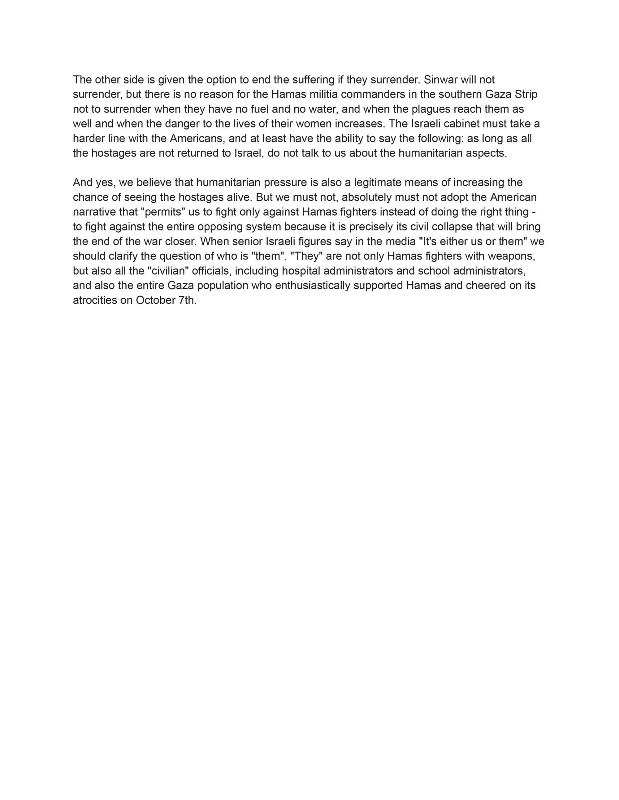 The way to win the war faster and at a lower cost for us requires a system collapse on the other side and not the mere killing of more Hamas fighters. The international community warns us of a humanitarian disaster in Gaza and of severe epidemics. We must not shy away from this, as difficult as that may be. After all, severe epidemics in the south of the Gaza Strip will bring victory closer and reduce casualties among IDF soldiers. And no, this is not about cruelty for cruelty’s sake, since we don’t support the suffering of the other side as a goal but as a means.