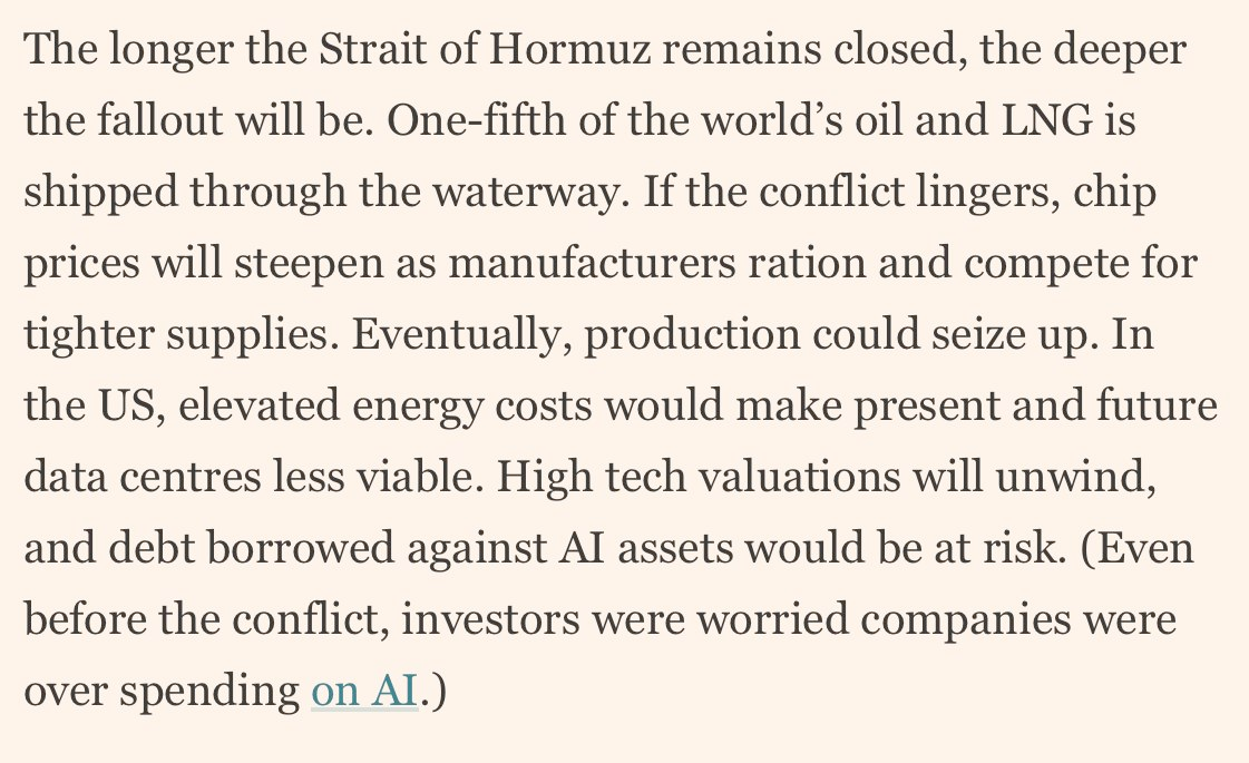 At this point the entire Western economy is just a big, artificial bubble waiting to pop. Their stock market is just Microsoft, NVIDIA, and Oracle in a trenchcoat, selling each other dodgy GPUs and flashing investors. And what does this pyramid scheme depend on, at the very bottom? Energy, hideous amounts of it, literal money to burn. But now the whole pyramid scheme is sinking in the Middle East, where the dumbest money was.