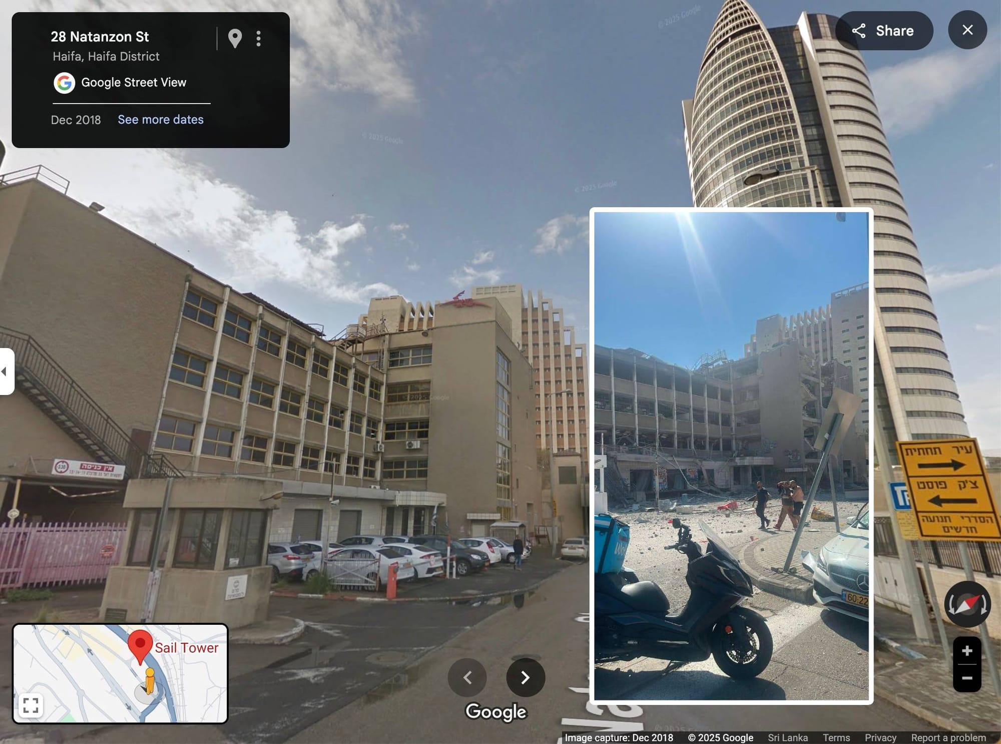 Haifa got hammered so hard you can't even see its main landmark, the Sail Tower, in this shot. 'Israeli's' military censorship has also broken down so hard that I have multiple angles on this, including impact.