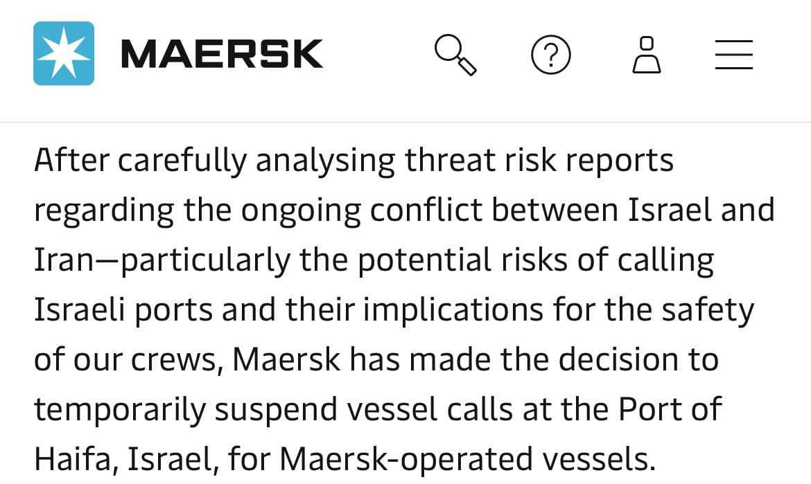 Remember always that what we call the economy is a psychological phenomenon and that the stock market is just rich people's feelings. And those are getting hurt by the attacks, and made worse by the cover-up. For example, Maersk, one of the biggest shippers in the world, had already announced that it would “temporarily suspend vessel calls at the Port of Haifa, Israel, for Maersk-operated vessels.”