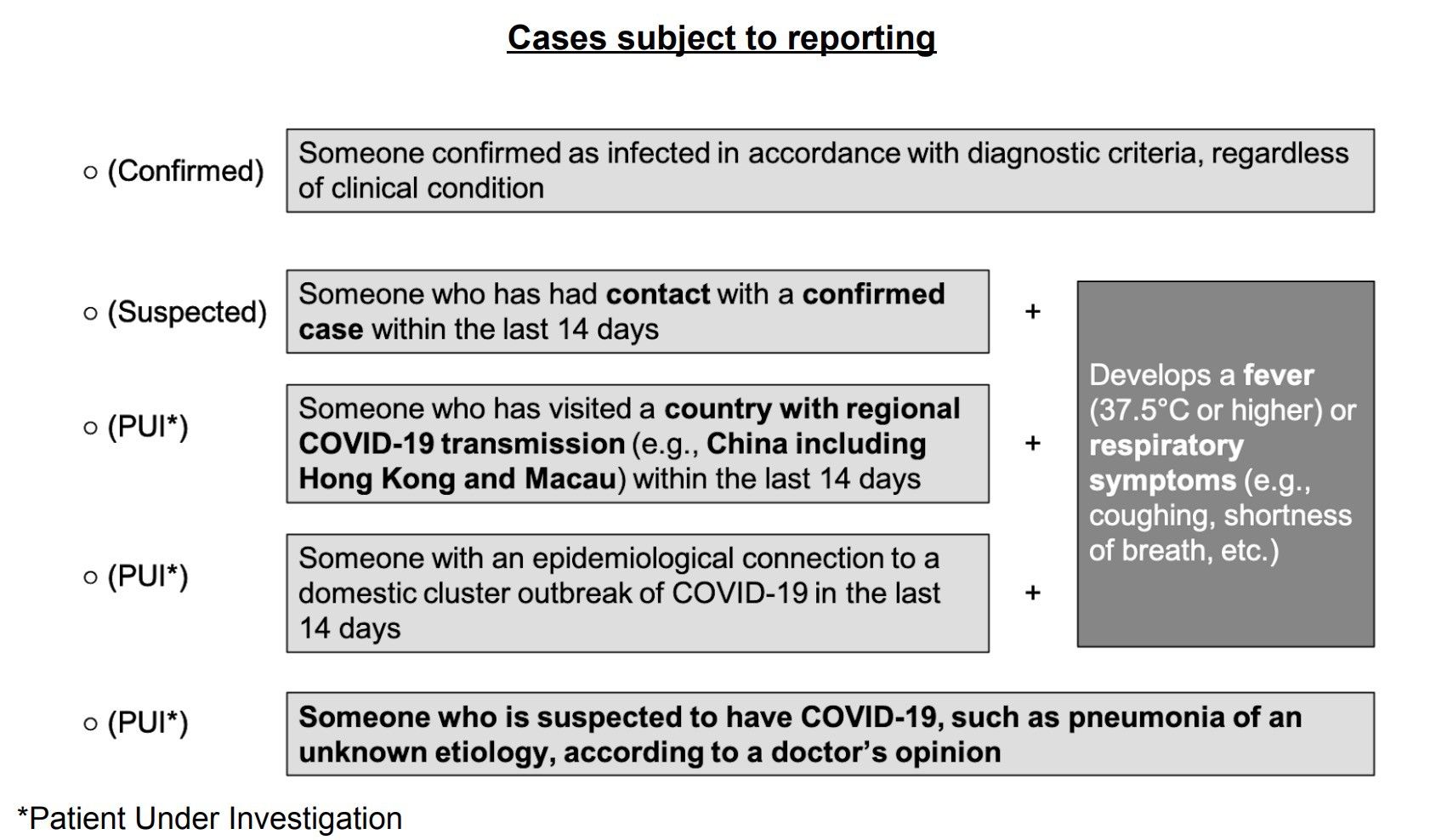 Cases were broadly classified in three ways. Confirmed, then their contacts (suspects), then patients under investigation (PUIs).