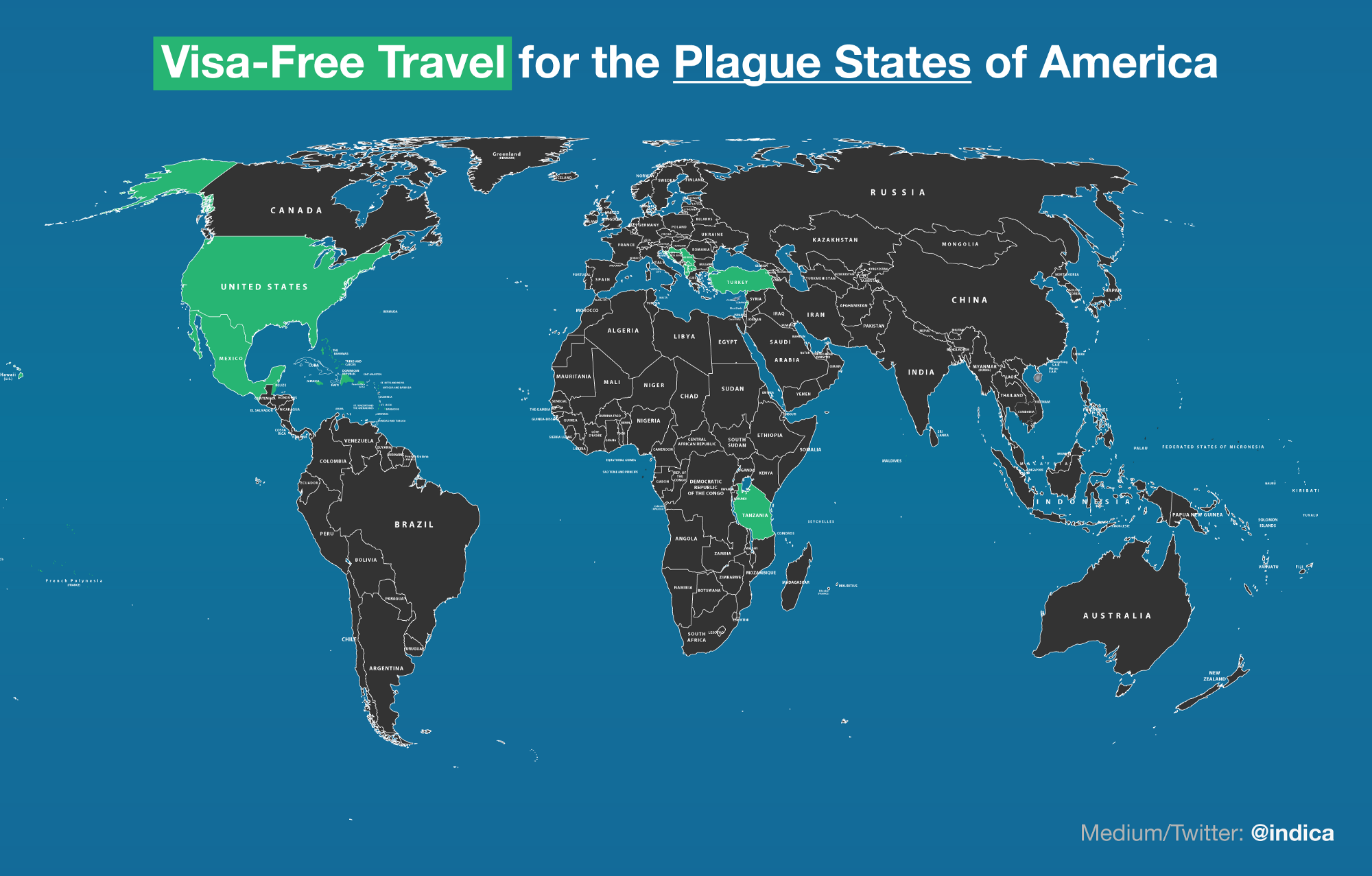 America is not united anymore and it’s barely a state. They have crashed right through failed state into a plague state, unwelcome across the world. This has been predicted, including here. Now it has come to pass. Just look at the map.