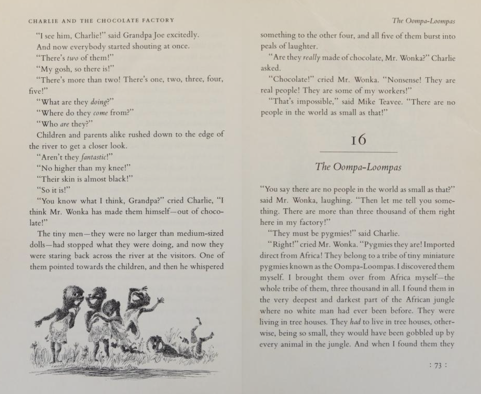 And again, it’s important to understand when this was. Martin Luther King gave his I Have A Dream speech in 1963. Charlie And The Chocolate Factory was released in 1964, and this was the version that people read until 1973. The popular film came out in 1971, selling even more of this demented version of the book.