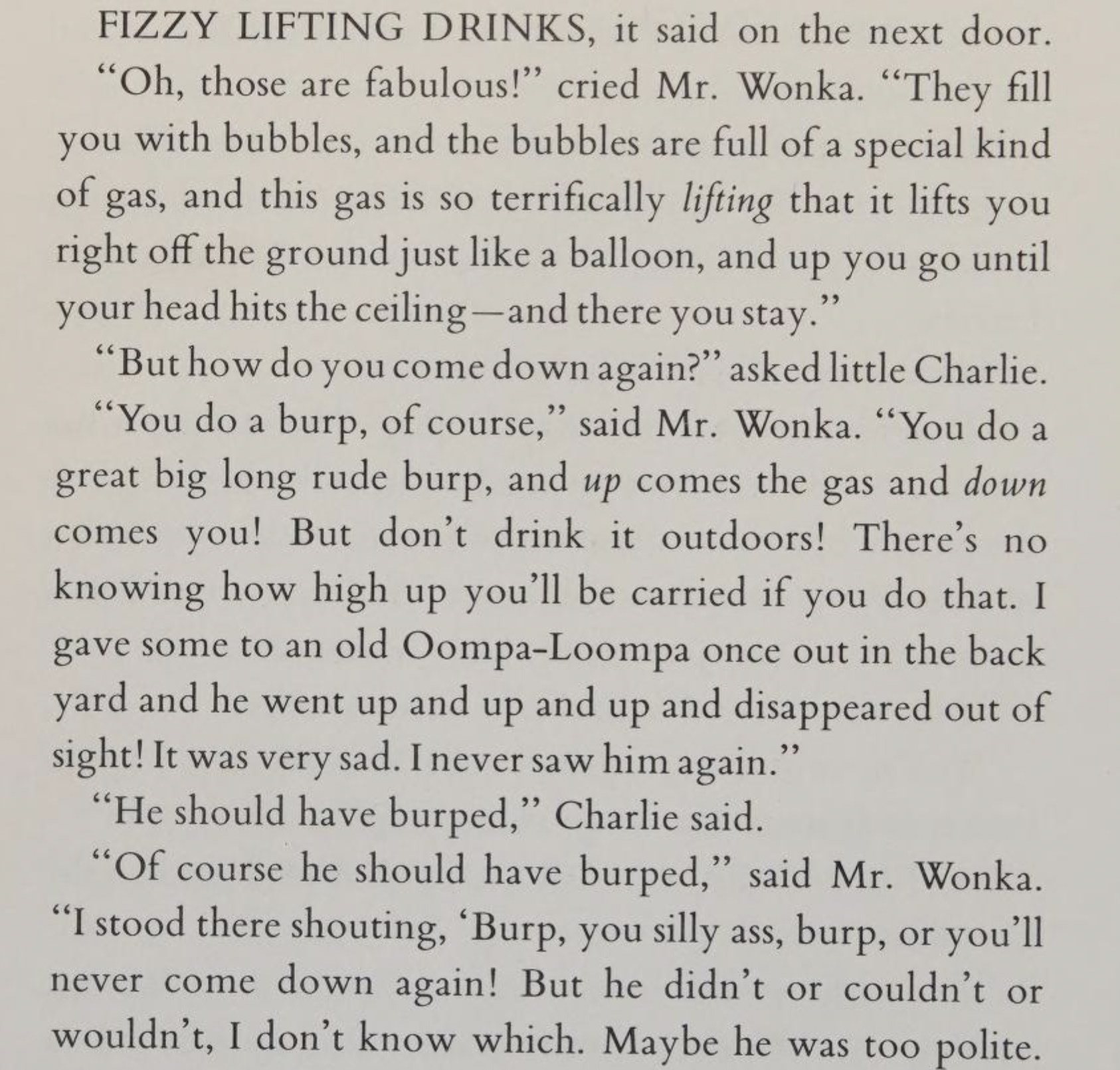 The book also spouts the colonial nonsense that this was all for the betterment of colonized people. Charlie And The Chocolate Factory literally has a white man in a pith helmet counseling a black man that it would be better to leave the place cacao beans are from to work in a factory for cacao beans.