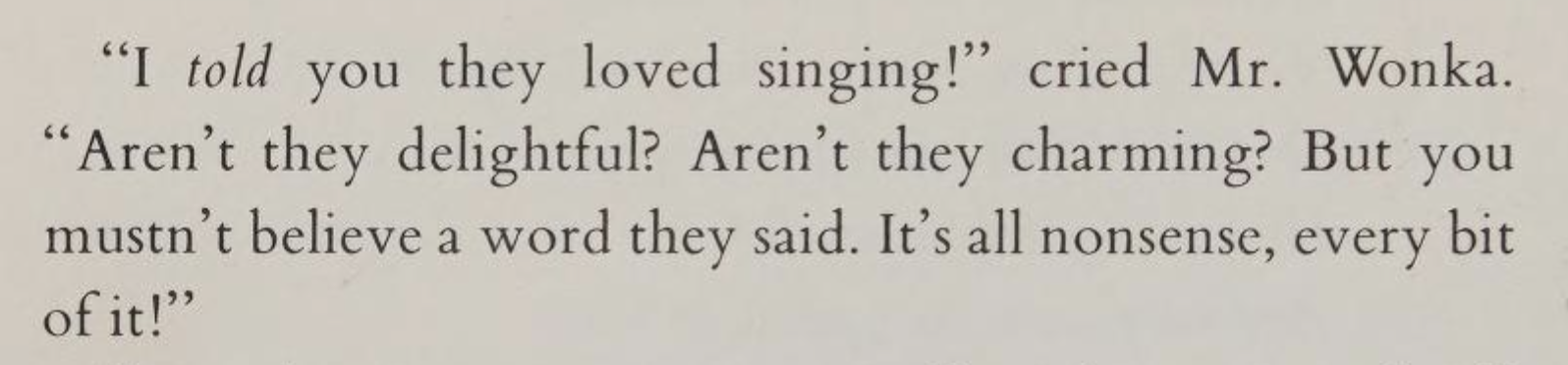 “So I shipped them all over here, every man, woman, and child in the Oompa-Loompa tribe. It was easy. I smuggled them over in large packing cases with holes in them, and they all got here safely. They are wonderful workers. They all speak English now. They love dancing and music.”