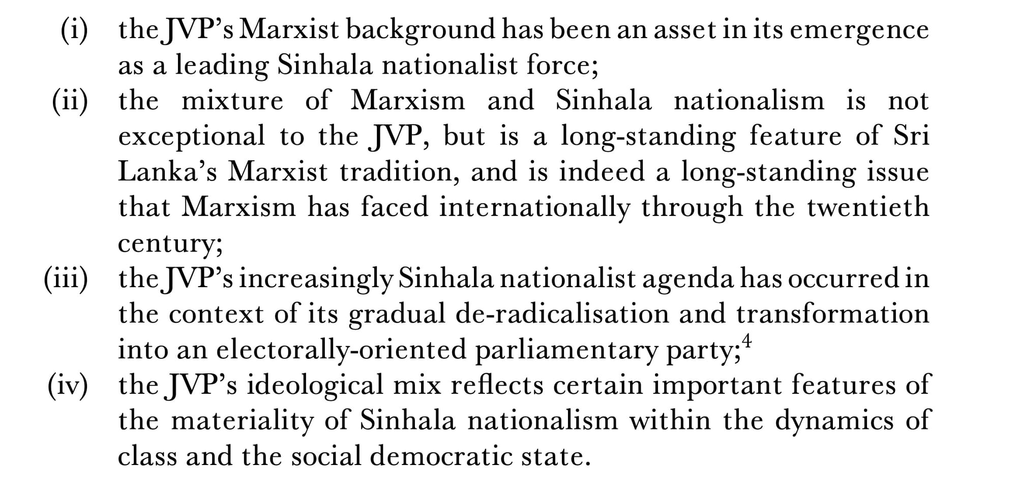 What I must add from the Tamil perspective is that whatever the JVP said, “in operational terms, this effectively translated into an agenda and tactical programme that was little different to that which successive generations of Sinhala chauvinists have deployed since the mid-1950s… On the basis of these actions, the JVP is viewed by large sections of Sri Lankan society, and particularly by the Tamil community, as a Sinhala chauvinist organization.”