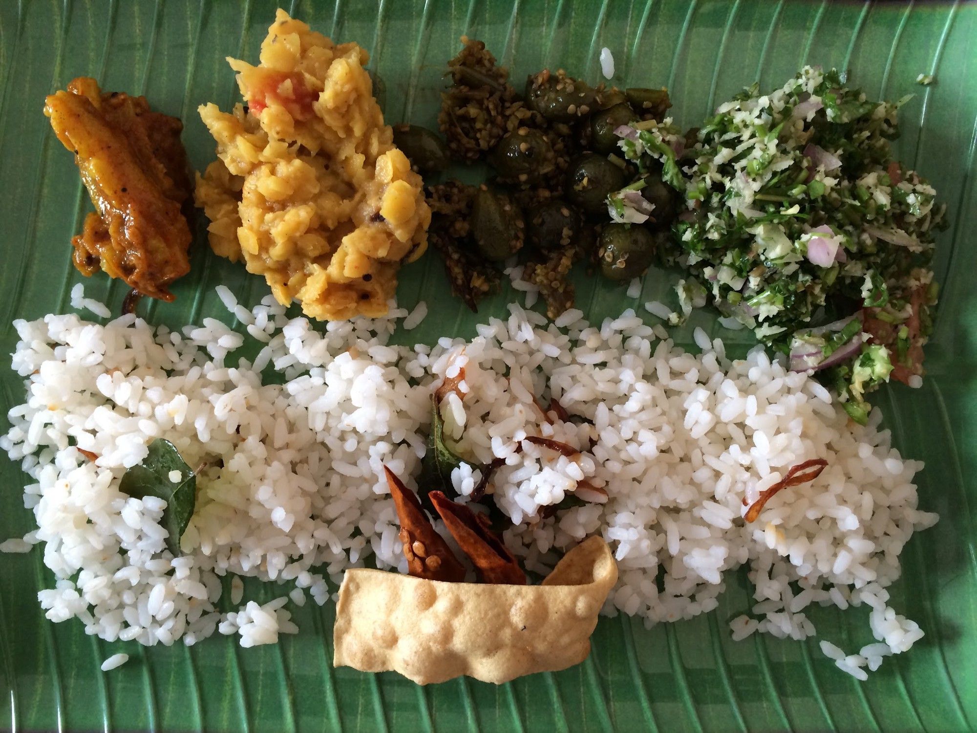 Unlike western food, Sri Lankan food is never centered around a protein. The center of every meal is always a carb — rice, roti, string hoppers, etc. Around that nucleus you get a rotation of vegetable curries — potato, gotu kola (greens), dhal, a coconut sambol. Only then do you get the meat, usually a fish.