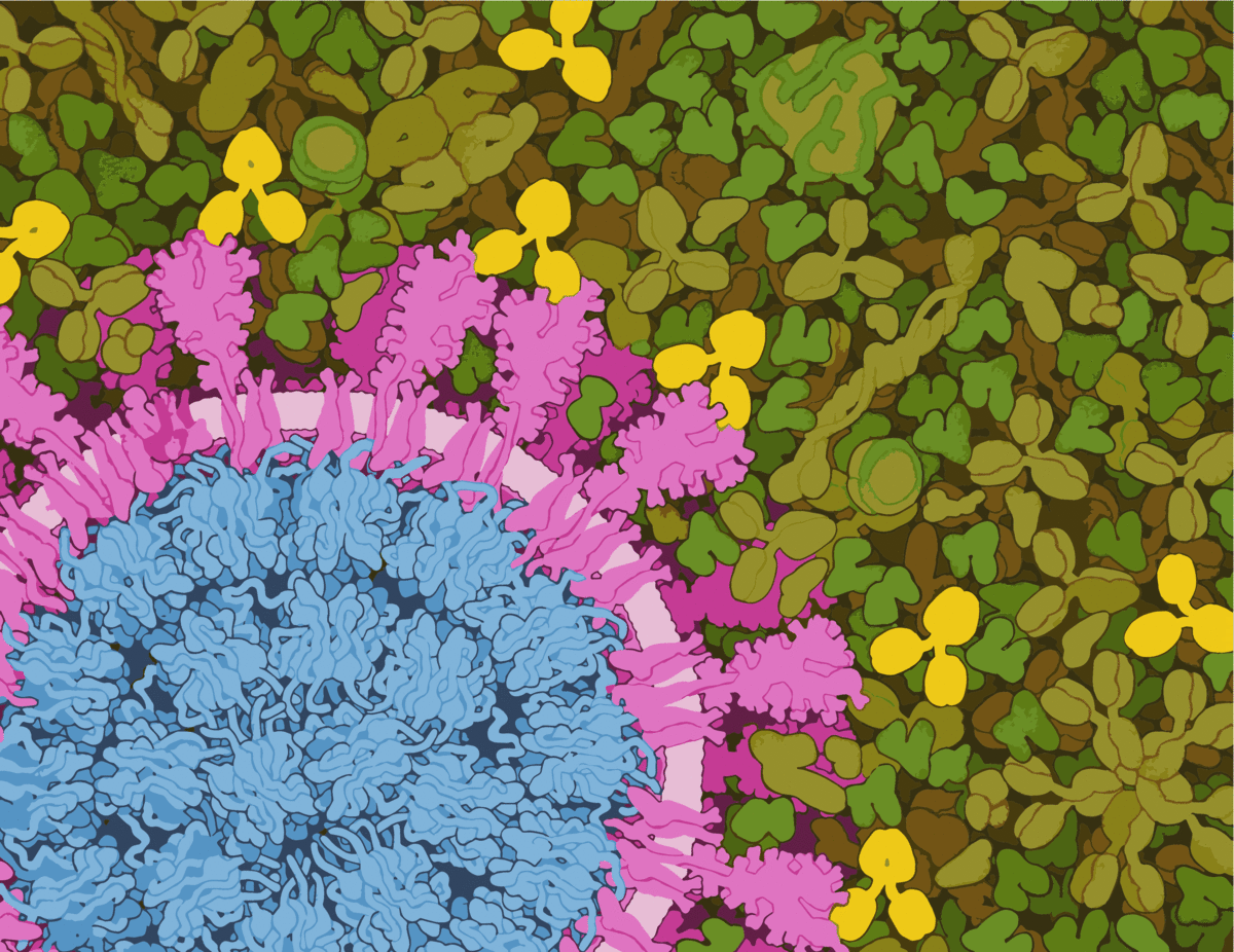 The killer thing about this novel coronavirus is that it’s novel. When it’s swimming around the warm mucus of our lungs, our immune system is like “new proteins, who dis”? Our antibodies have never seen this body before, so they don’t attach to COVID’s spiky crown (the S protein, in pink). They just let it go. That’s the problem.