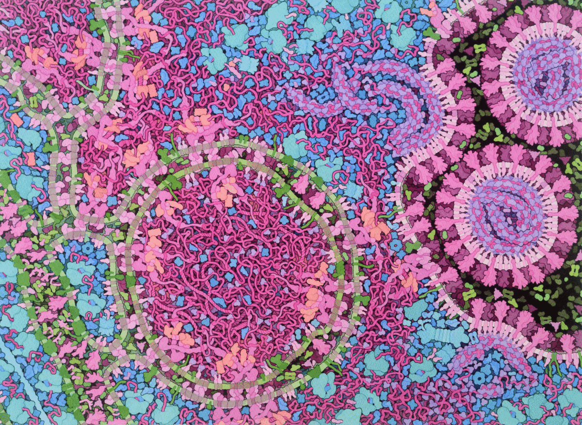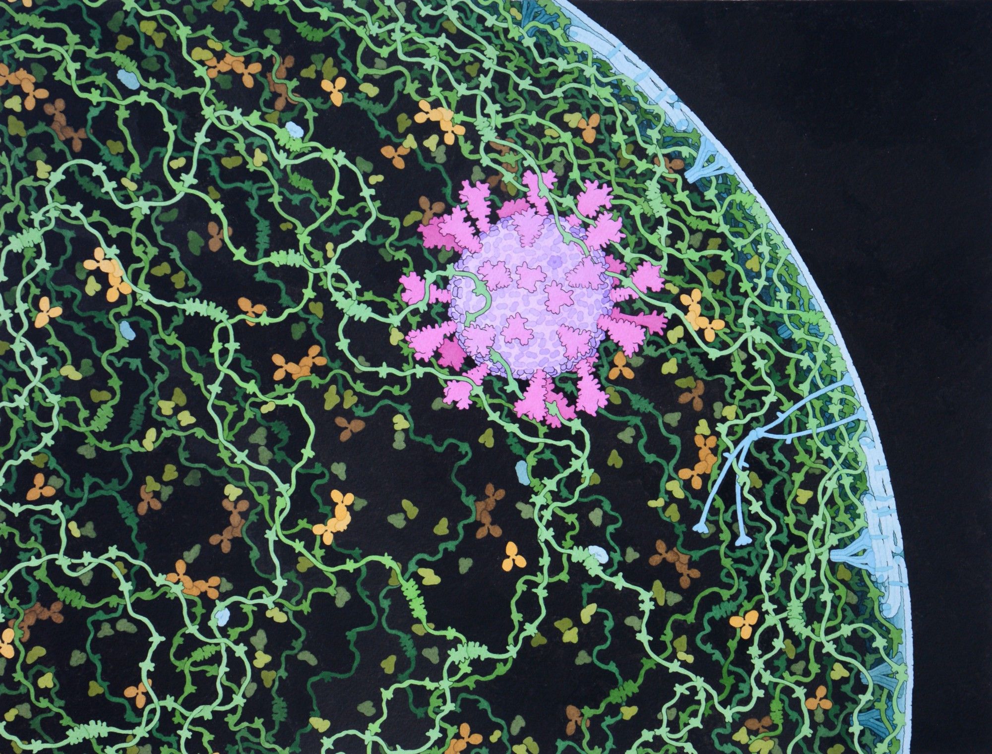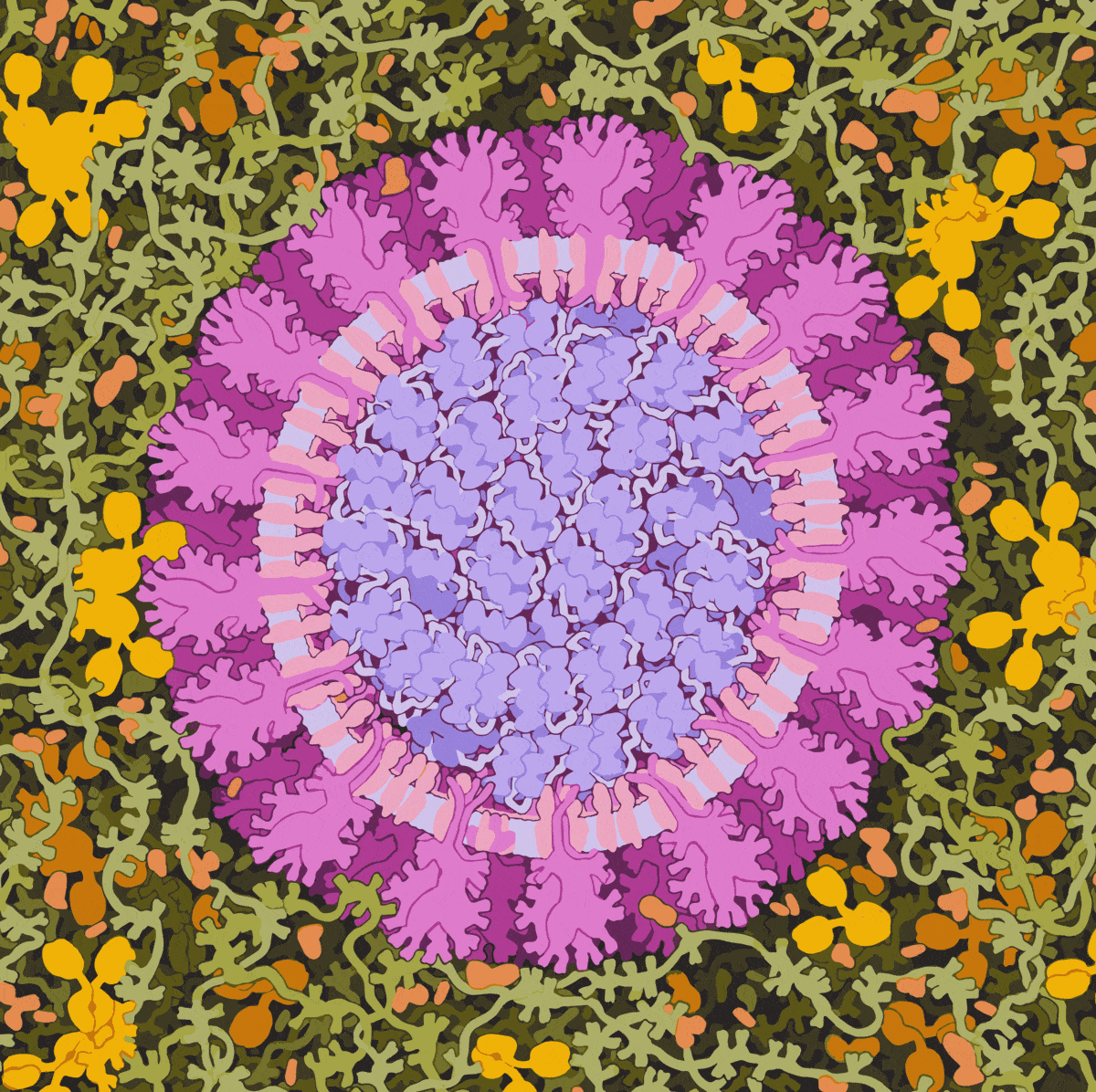 As we leave the microcosmos, please remember that above every drawings is human tragedy. Someone is coughing, violently. Someone is so tired they cannot stand in the shower. Someone else is reaching out to help, and getting virus in the face. Someone is lying in a hospital bed, terribly alone, gasping for oxygen that their lungs cannot — on a molecular level — receive.