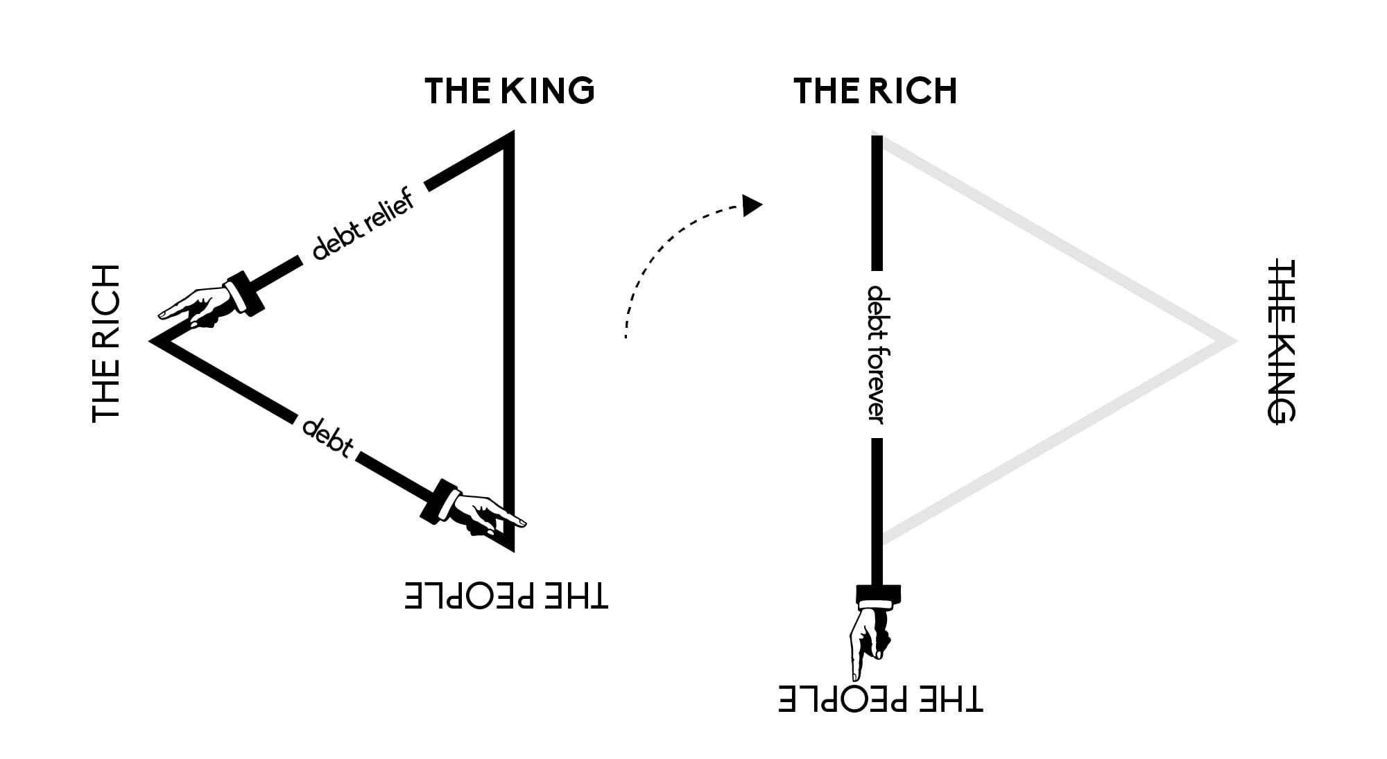 You can view the triangle as having a monarch on one side, oligarchs on the other, and people on the third, usually as bystanders. A monarch might come from the oligarchy and preserve their interests, but occasionally they might do something crazy like actually relieve (debt) pressure on the poor. For this, they would be called tyrants, or populists, and violently attacked by the oligarchs. This was as true for ancient Greek or Roman civilizations (which I'll refer to) as it was centuries ago, or even now.