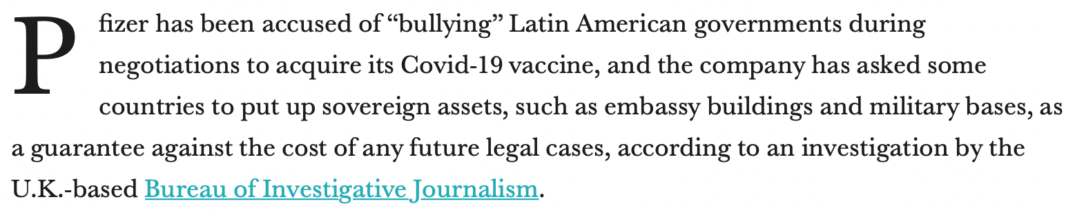 Seriously, if anyone in South America sues over anything, Pfizer will occupy your fucking country. This sounds completely unbelievable, but here we are. We got drug companies threatening to take over embassies.