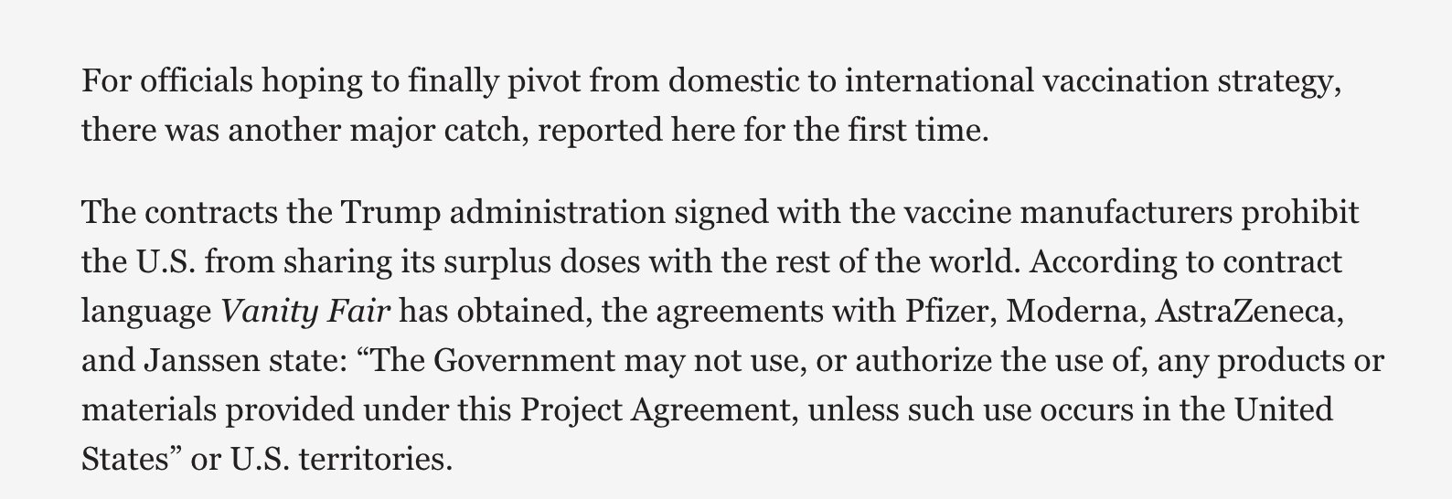 Now India has fallen, COVAX deliveries have largely stopped, and bodies are starting to fall all over the Global South. And this isn't because of Trump. It was Biden who embargoed basic vaccine supplies. Biden has blocked patent free vaccines. Biden is the one killing the world. It doesn't even make sense for America, but that's mafianomics for you. Forget following common sense, just follow the money.
