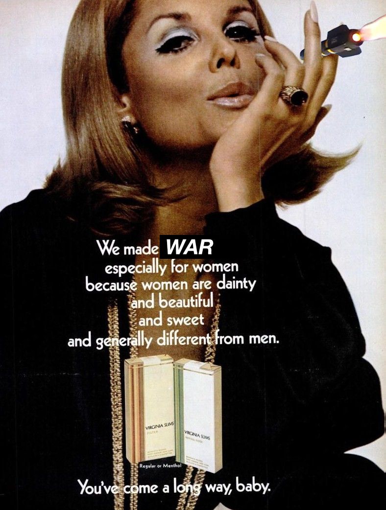 First it was fighting terrorism, then it was spreading democracy, and now it's somehow feminism. Whatever gets taxpayers to open their wallets for the endless, bloody grift. Now they're using women's rights to sell war the same way Philip Morris used women's rights to sell Virginia Slims."You've come along way baby." Now smoke on a Hellfire Missile and die.