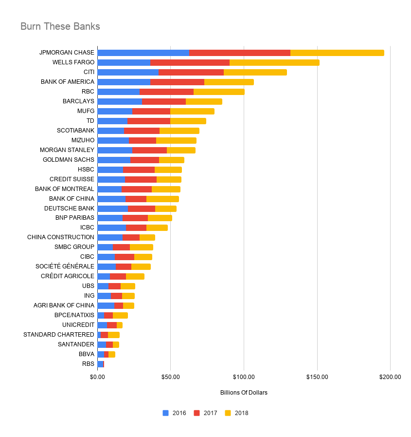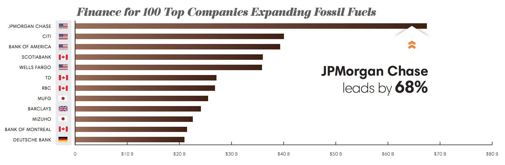 33 banks, led by JPMorgan Chase, have financed fossil fuels to the tune of $1.9 trillion since 2016. They have spent over $600 billion to expand the use of fossil fuels. The world is on fire, and they’re funding more gasoline.
