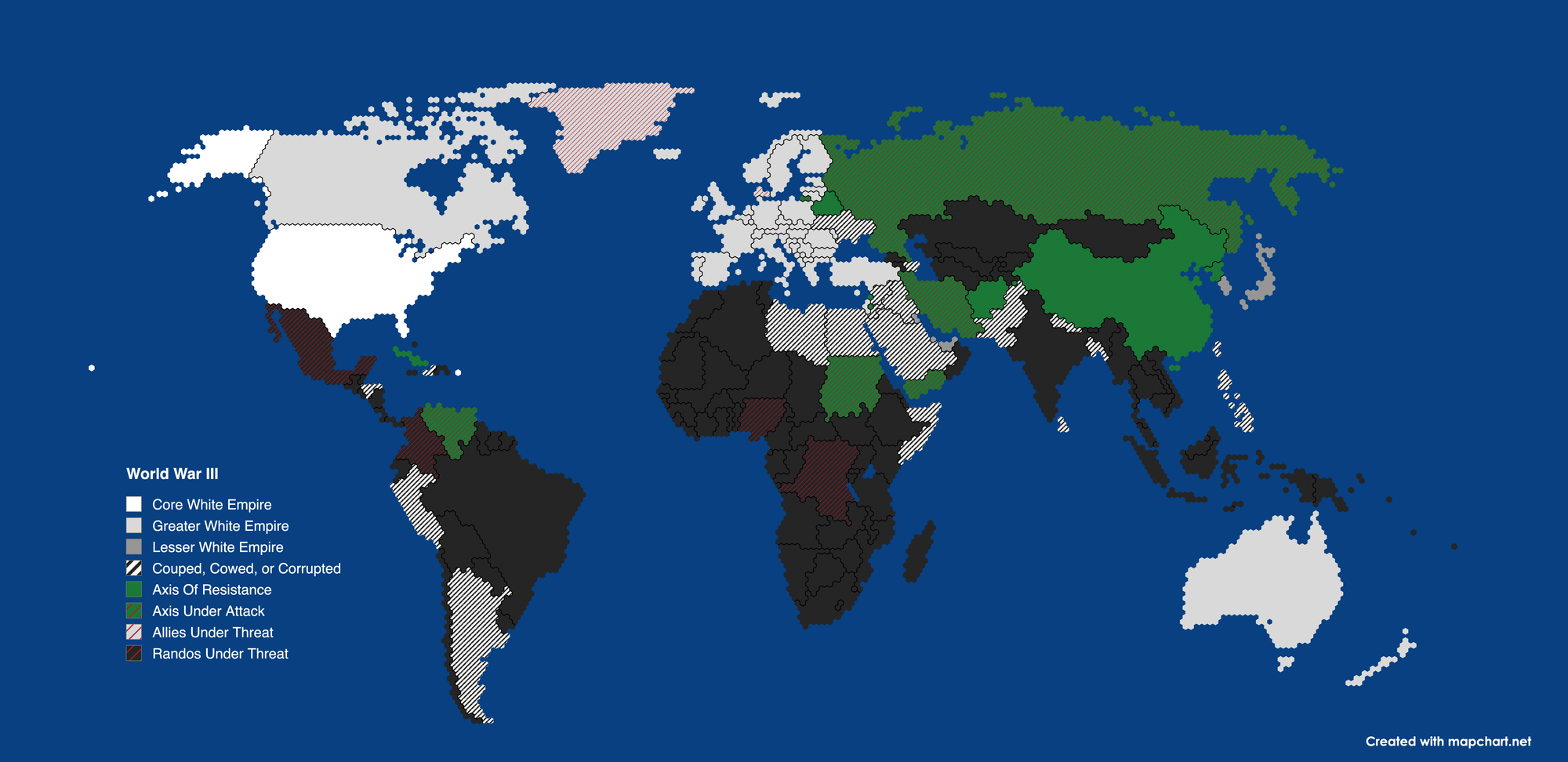 Green is the Axis of Resistance, which is not yet a formal alliance, unfortunately. The places in green and red stripes are under attack right now, and everybody is of course threatened. The White Empire hates all forms of sovereignty, and with tariffs the whole world is effectively under siege.