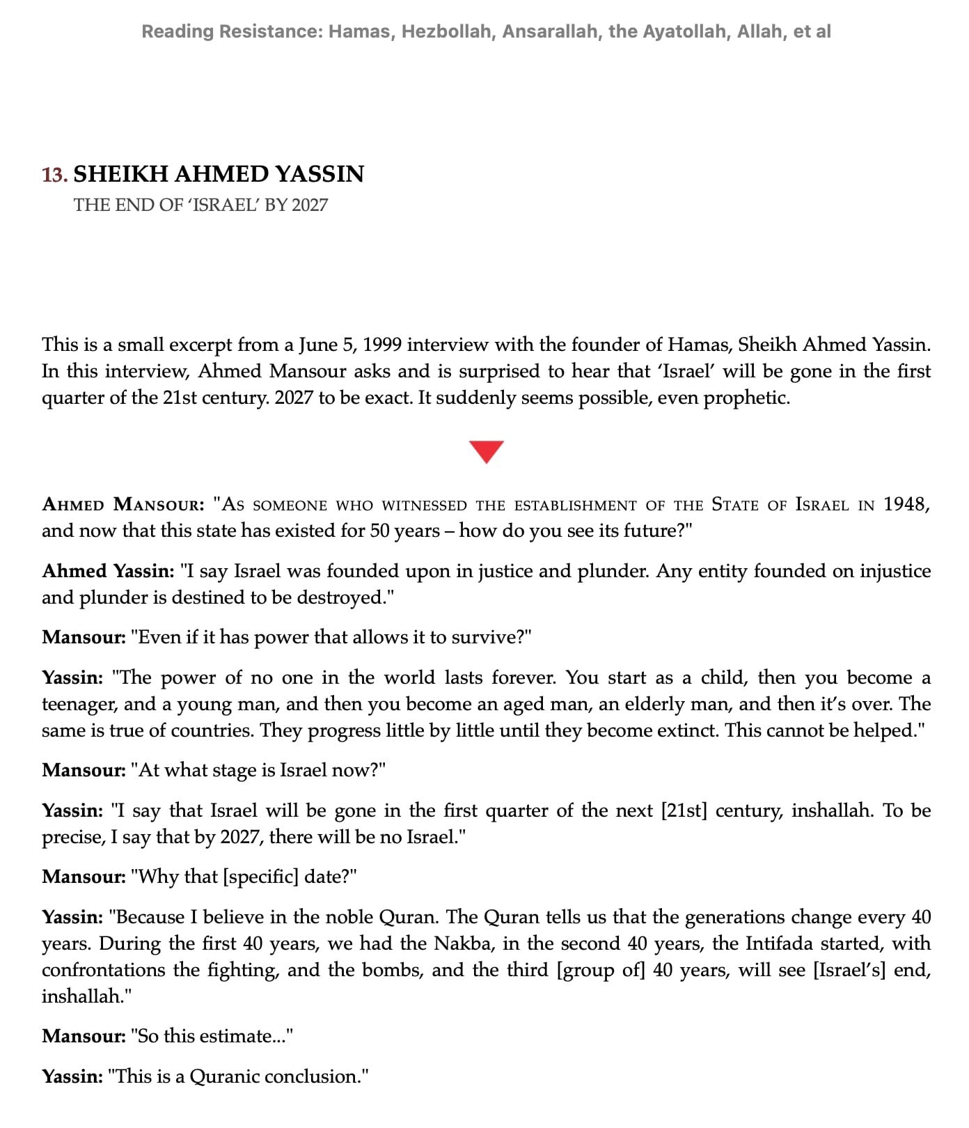 The only difference is the Resistance, the sheer persistence of heroes like the men of Hamas, PFLP, Palestinian Islamic Jihad, etc. I remind you that Hamas is still functioning, the Palestinian people are still here, and we even talk to a gentleman from Gaza—Muhammad Al-Turk—regularly on Resistance Is Fertile. Just as 'Israel' is the fount of all evil, Palestine is the fount of good, and it's deeper. As Hamas founder Sheik Yassin said when it seemed unbelievable (1999), “I say that Israel will be gone in the first quarter of the next [21st] century, inshallah. To be precise, I say that by 2027, there will be no Israel.”