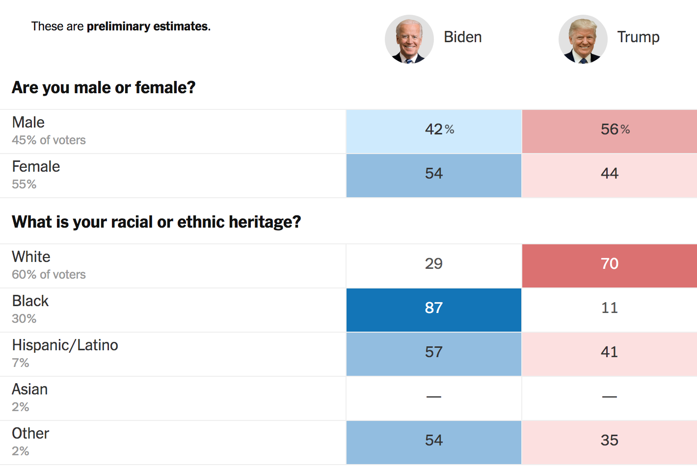 87% of black people voted for Biden. 91% of black women. This is the only way any decent human being should vote, but white people are insane. Some of them, I assume, are good people.