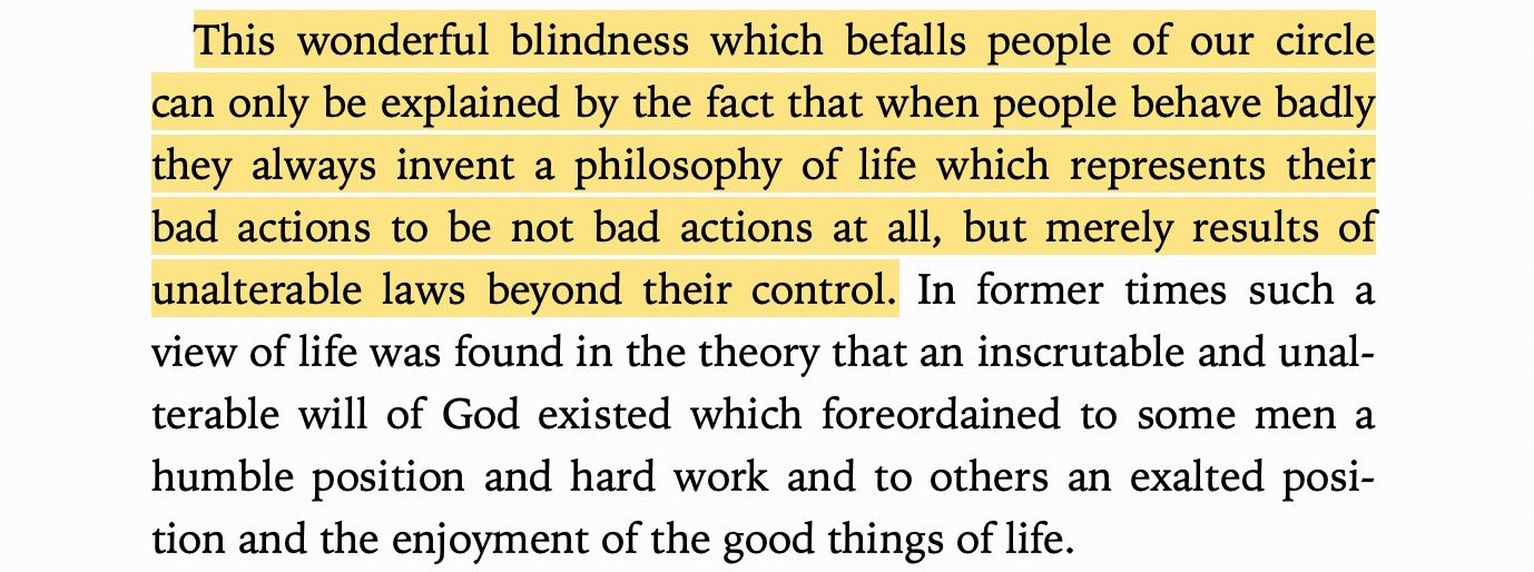 As Tolstoy continually hammers away, we are pruning the branches and not touching the roots. Because we still want to eat the forbidden fruit. We want to take the fruit of other people's labor and nature, we just want to do it more politely. So we assuage our own guilt without actually improving things.