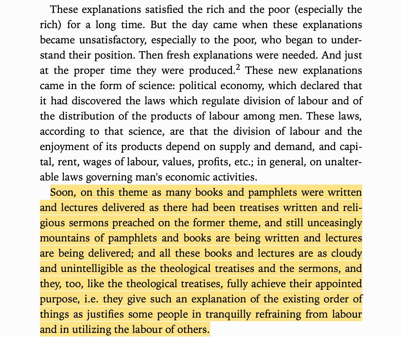 Even good economists (like Thomas Piketty or Branko Milanovic today) are still producing reams of data to point out something obvious to any poor person. That inequality exists, and is bad, duh. They're screaming out the ivory tower window, but never do they question tearing the damn thing down. Tolstoy has a sick burn for these guys as well:
