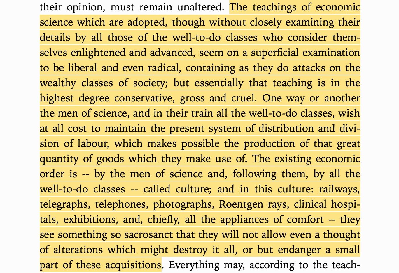 Tolstoy really unleashes some sick burns on economists. I hate economists with an inchoate ire, but he really finds the words. As he knew in 1900, economics is a pseudo-science. No other science will follow a false assumption (like rational actors) forever—it would be like chemistry starting from the wrong periodic table—but economics does. No other science is allowed to conduct experiments (like trickle-down economics) on entire human populations, killing millions, but economics can.