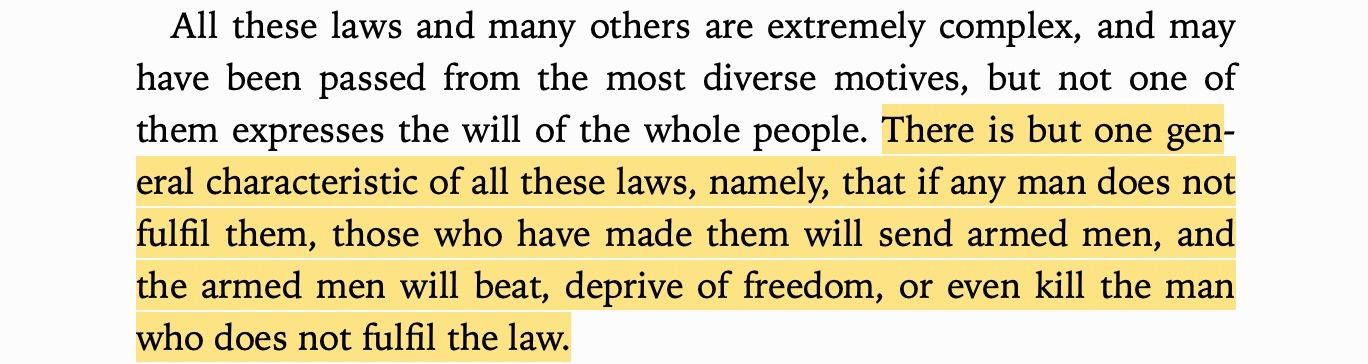 You know he's right. Everybody's all for the rule of law until they get arrested. We have all these fancy laws which break the golden rule. No one wants the law violently applied to them, yet violence is ultimately at the enforcing end of every law. Just happens that poor people get it and rich people get away. And we talk about 'rule of law', with all of our lawyer-priests and connections to help us get away. Tolstoy calls for doing away with the whole thing.