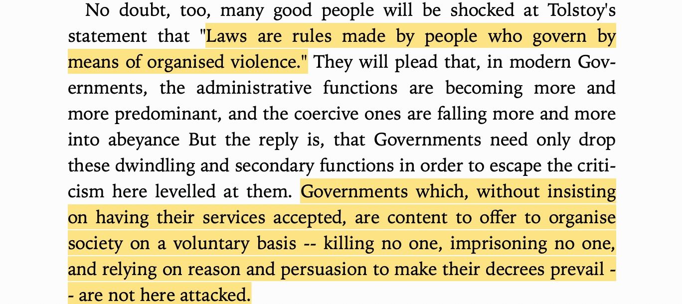 But this sounds crazy. Even the most radical campaigners call for different laws, different punishments. Not a complete absence of enforceable laws. And yet this is exactly what Tolstoy calls for. Here is the premise in the foreward from his friend and translator, Aylmer Maude: