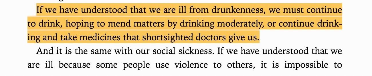 What Tolstoy is arguing is that trying to fix this system within the system is impossible. It's a category error. It's as Martin Buber wrote, "One cannot in the nature of things expect a little tree that has been turned into a club to put forth leaves." Tolstoy's point is to put the club down. To abjure violence in all its forms, especially structural violence. And to understand that violence is the essential structure of the state.