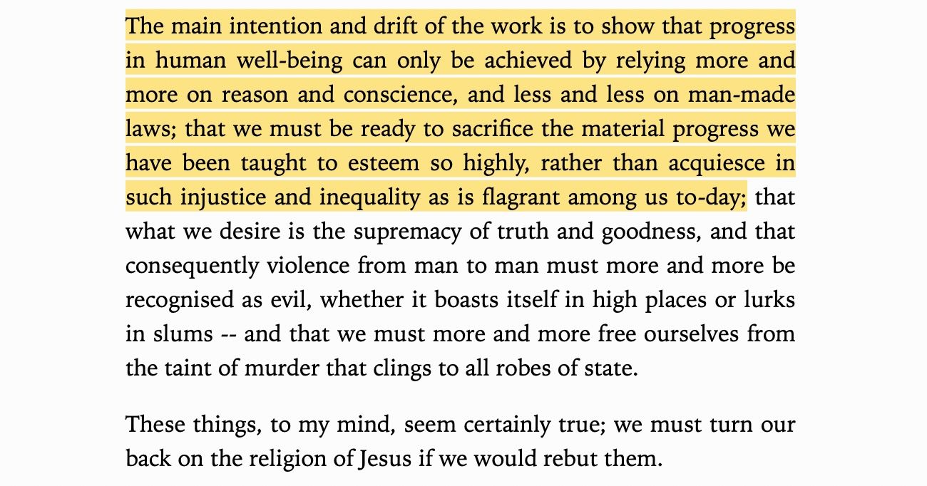 As his translator and friend Aylward Maude says in the intro, degrowth is in many ways the main intention of Tolstoy's work. The idea that we must sacrifice material progress because it comes at the cost of our soul. Tolstoy was an anarchist, but they couched this as a deeply Christian idea as well. A commandment really. What does it profit a man to gain the world and lose his soul? As we are seeing in the 21st century, you ultimately lose both.