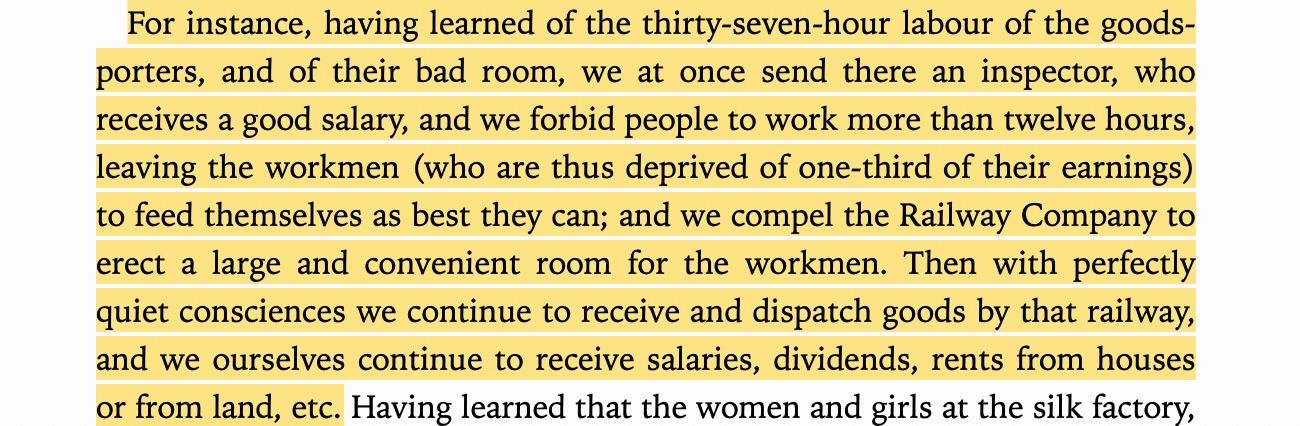 Now, lots of people do feel some guilt over this, and Tolstoy skewers our usual bleeding-heart reactions, asking to modify the earth-and-soul-devouring-machine slightly, but never to actually turn it around. He says that we try to improve working conditions, without changing the fundamental condition of work. We try the effects, without changing the cause.