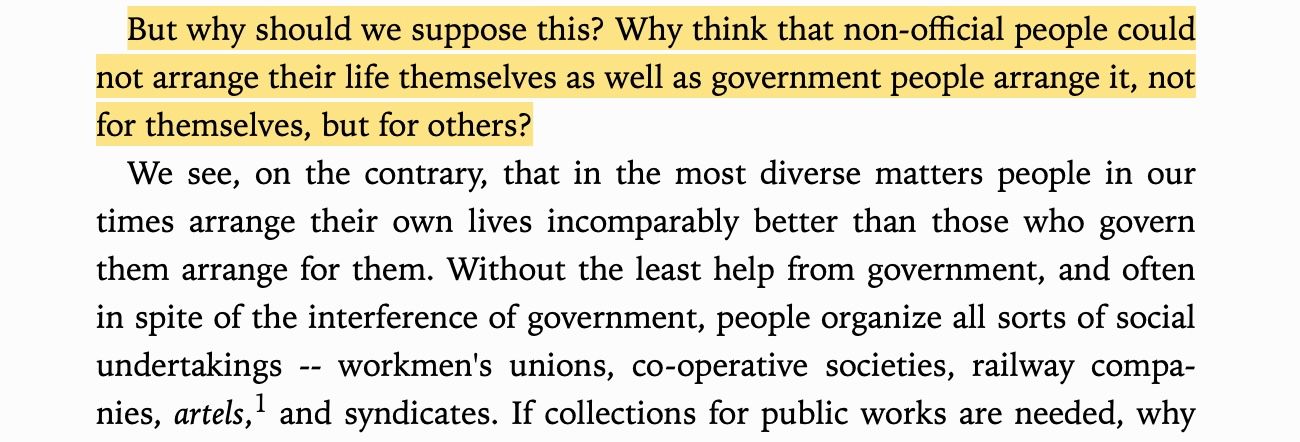 Hence here we get to the anarchist solution to this problem. Not the absence of institutions, but the absence of violence in the institutions. So people could decide to constitute a police force, but that police force could not arrest or kill. Governments could pass laws, but not enforce them. Thus you get to the crux of anarchism. Complete, terrifying, freedom.