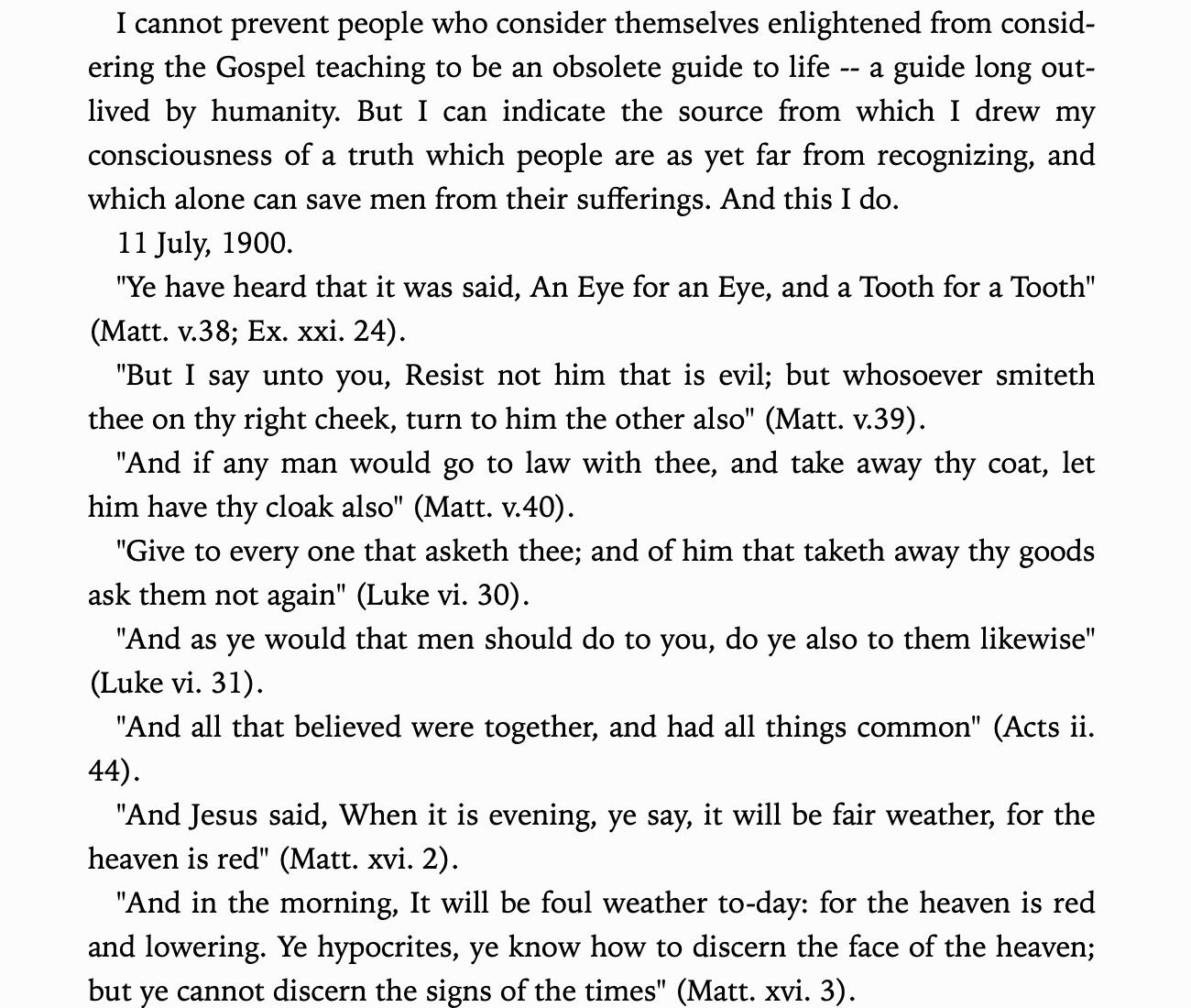 Hence I'll close with Tolstoy's invocation of his own chosen scripture, the inspiration for his work. An anarchist quoting gospel, I know, but Jesus was perhaps the original anarchist, in year zero of what we call modern times.