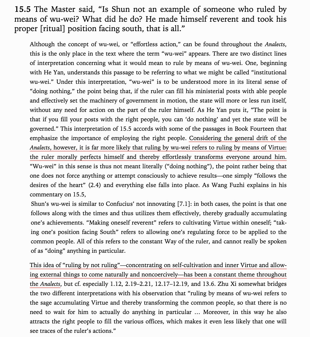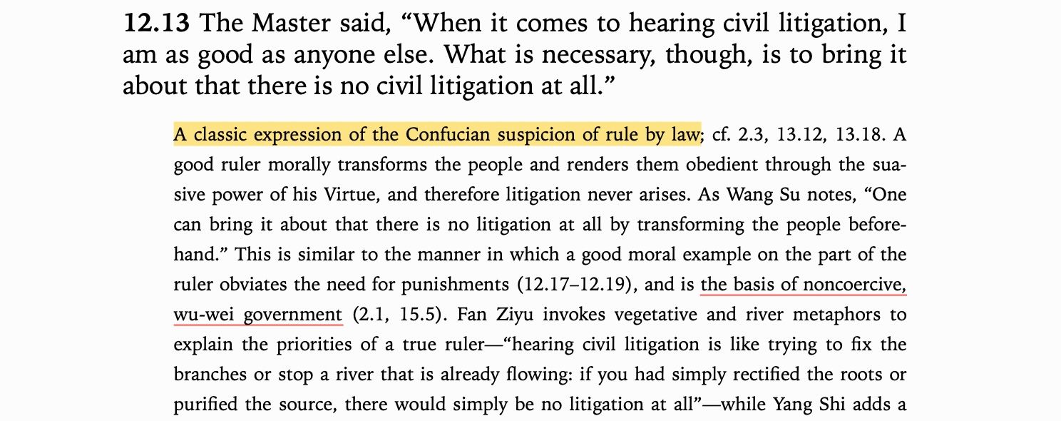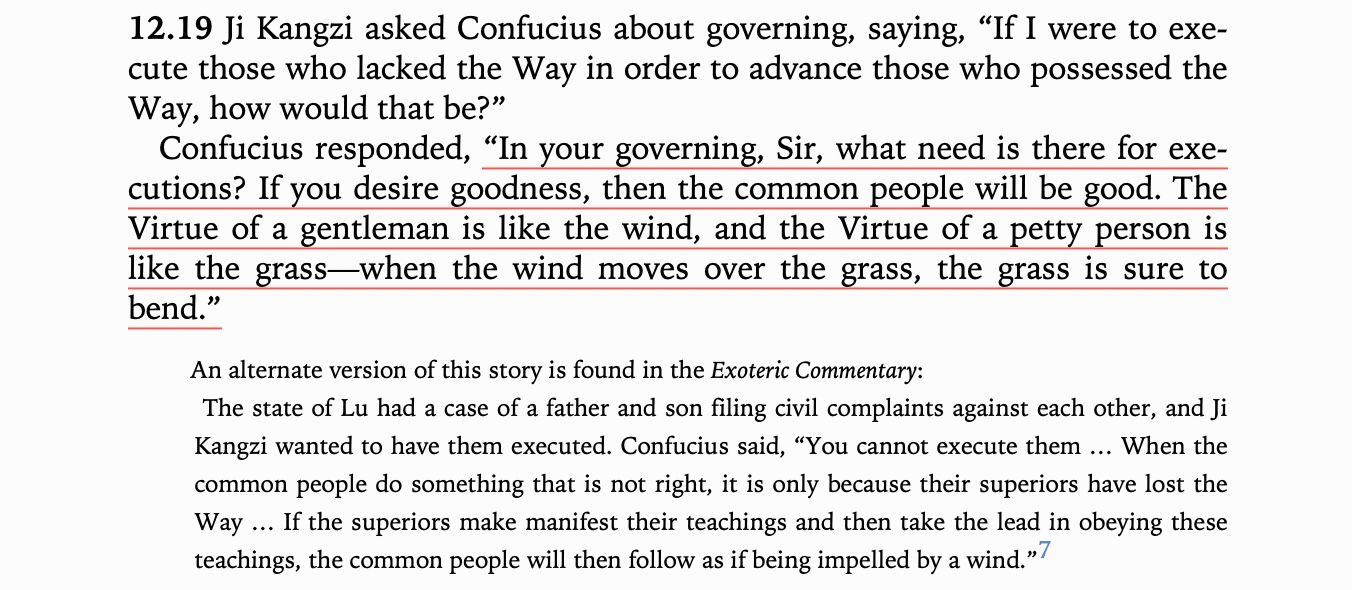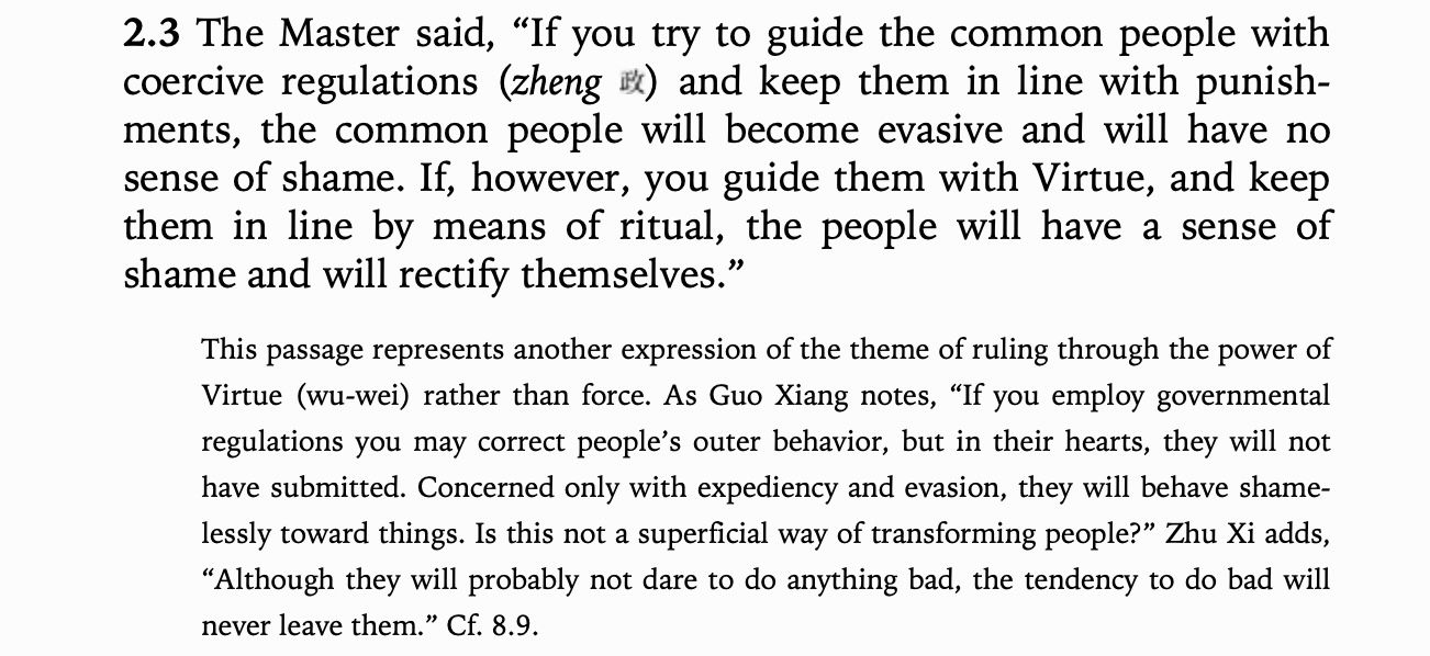 The Confucian idea of good government was fundamentally non-coercive. He devoted zero attention to beating the common people into submission and instead exhorted leaders to improve themselves. A good ruler would get themselves and their house in order, then sit back and rule by what I call 'vibes'. Take his description of an ideal ruler. Dude sounds like he does yoga.