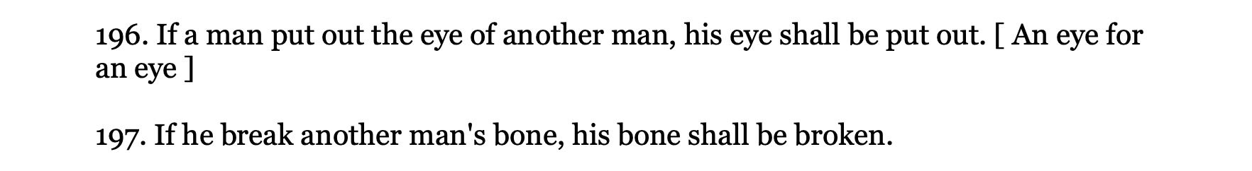 Around 1750 BC, the Babylonian king laid out a legal code that both physically and spiritually survives to this day. Hammurabi carved an eye for an eye into stone and that's still our basic conception of justice today. We think him barbaric for literally doing this, but are we any better? Today if you do something bad, the state will do something terrible to you. It's the same principle as eye for an eye.