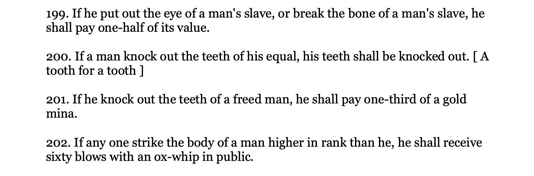 Hammurabic law was also wildly unequal, and we consider ourselves better than that. We’re not. Again, we’re probably worse. We’re shocked at Hammurabi’s description of slavery, but no age thinks that its own slavery is bad. As Tolstoy writes: