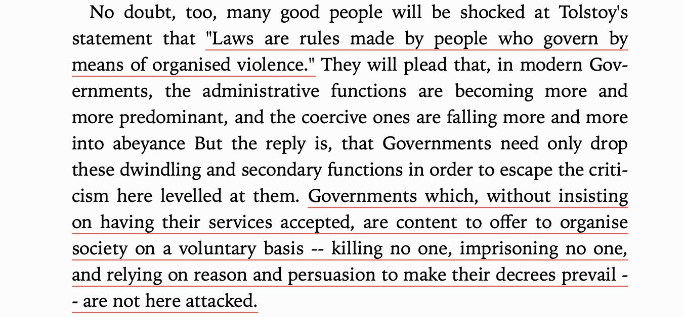 I was introduced to this idea through Leo Tolstoy. His thesis is simple. The state has no right to violence over us at all. None. He tears up the social contract, kicks Leviathan in the dick, and overturns the whole pot. All metaphorically of course, Tolstoy was nonviolent. Leo doesn't just attack bad laws. He attacks the rule of law itself.