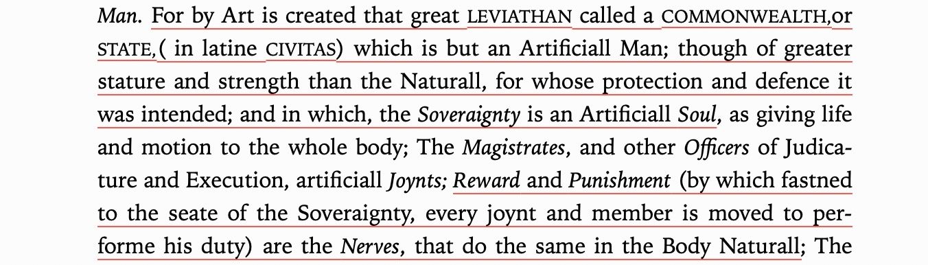 Who is eating us? Let's call him Leviathan. Leviathan is the Mighty Morphin Power Rangers model of governance. All of our (implied) consent combines into a giant, fighting Megazord called a state. We need this deadly robot because the world is full of scary monsters (other people) and without the state's violent protection we'd be at constant war. It's a protection racket. Hobbes himself says so: